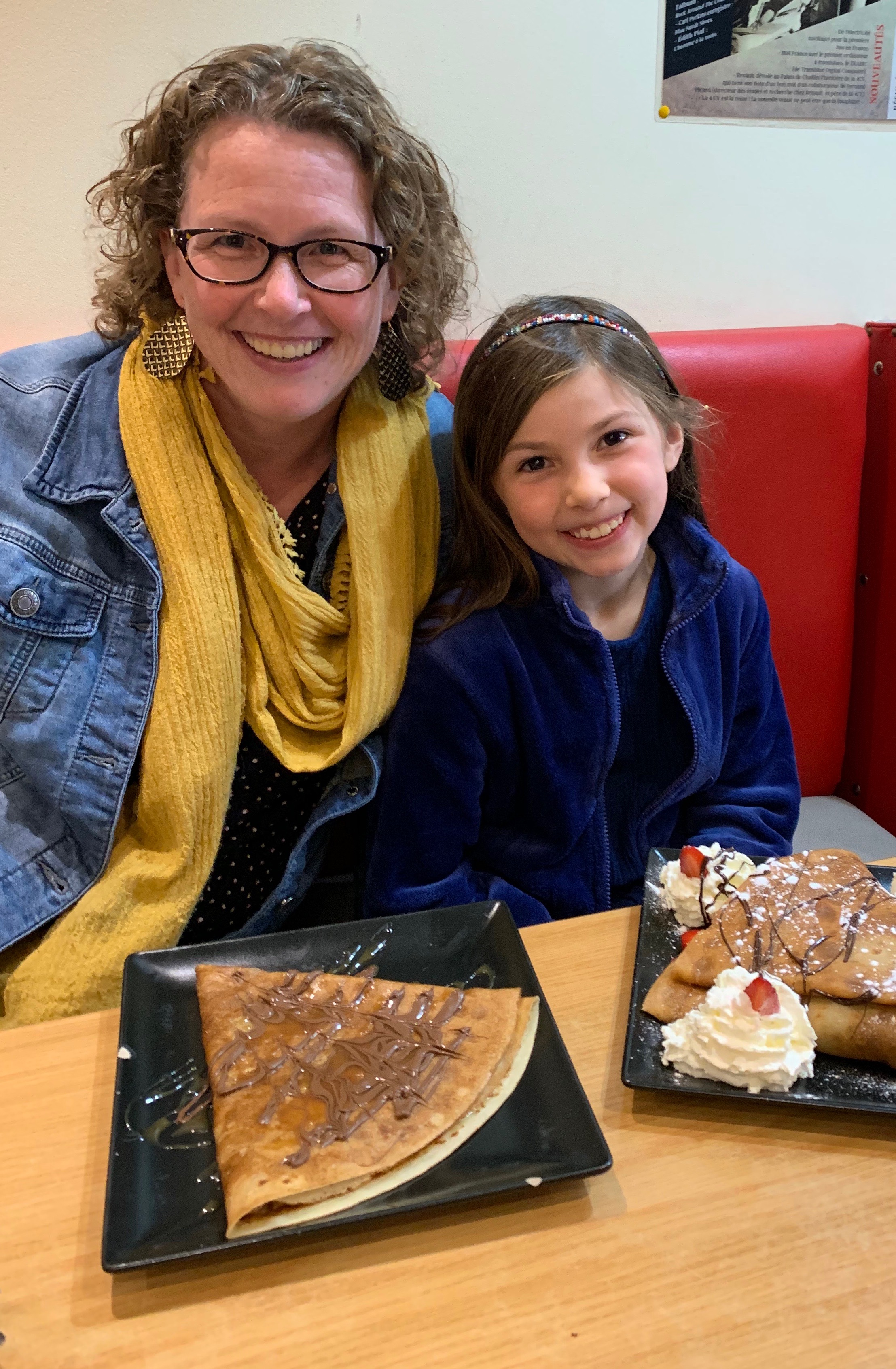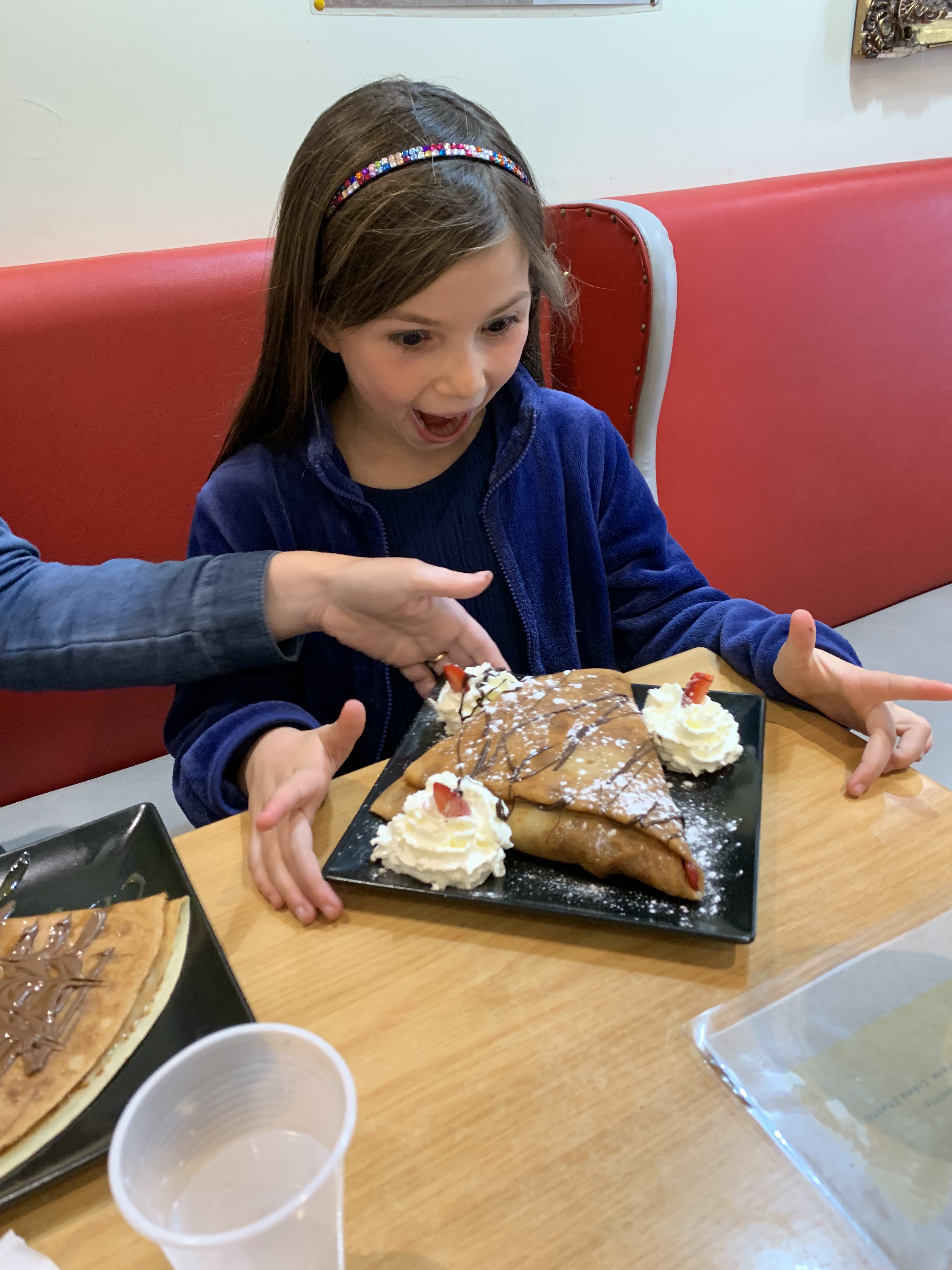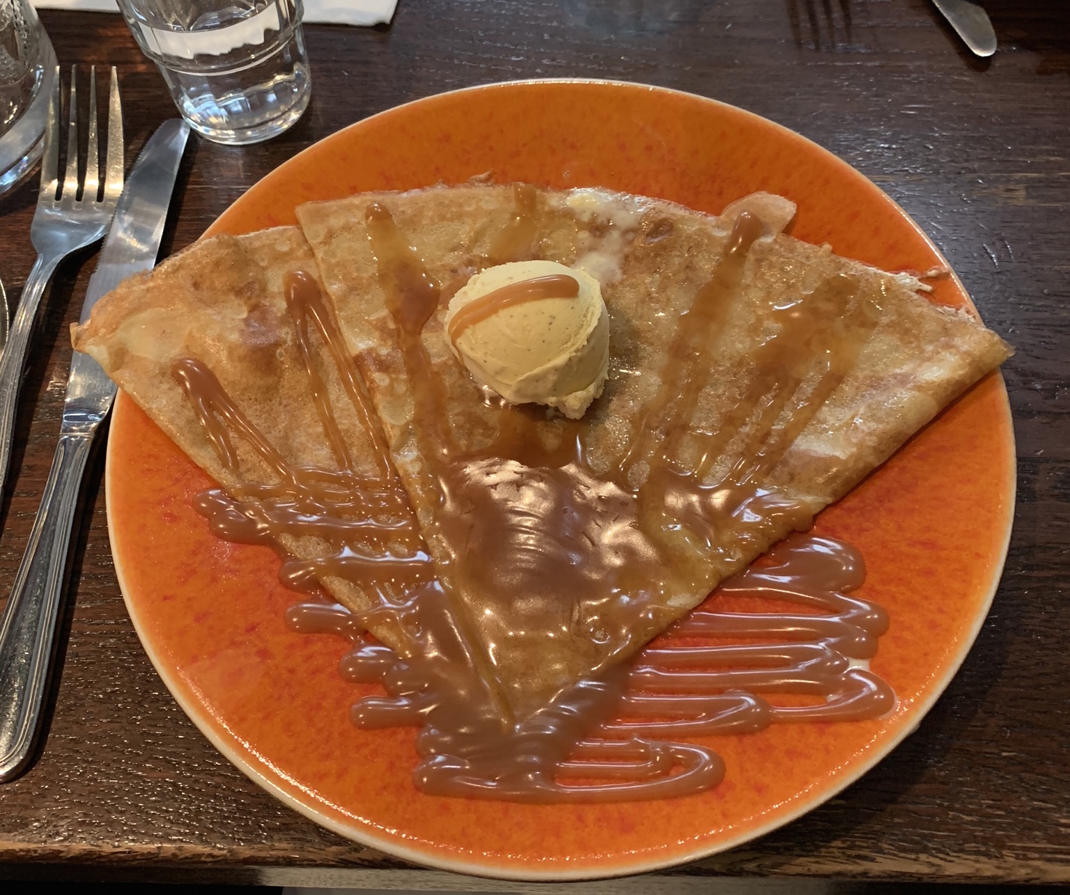 But we all enjoyed the walking tour… until hunger struck around 4pm.  The obvious solution: crepes!  We all ordered our favorites—jambon fromage for the ladies, while Jeremy tried the smoked salmon and Boursin.  All excellent.  But the piece de resistance was surely the sweet crepes that soon followed…
