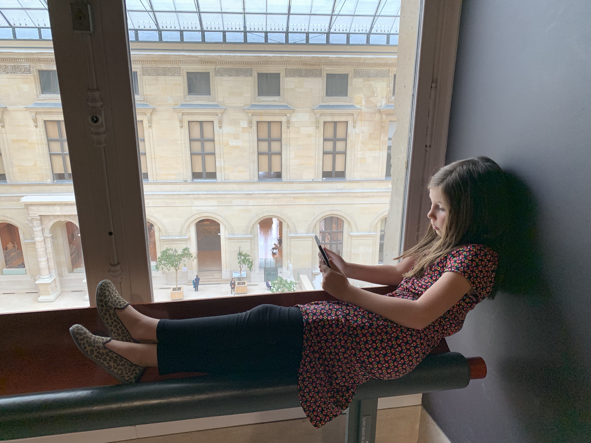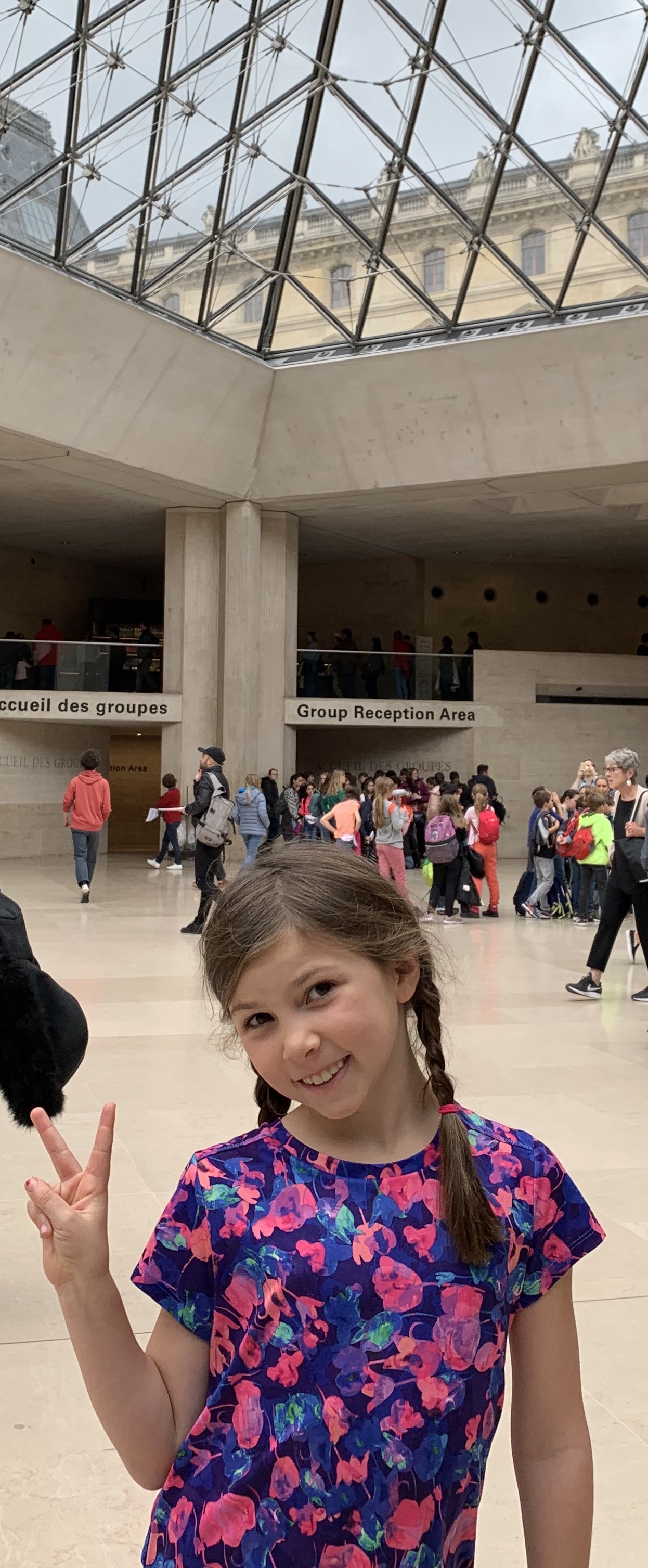 After a day at home, we decided we were ready to tackle… the Louvre.  So Thursday morning we set off to this positively enormous museum, and began our day with a first sighting of the pyramid.  Inside, Penelope showed a glimpse of the tween she will soon be, flashing a saucy pose for the camera.