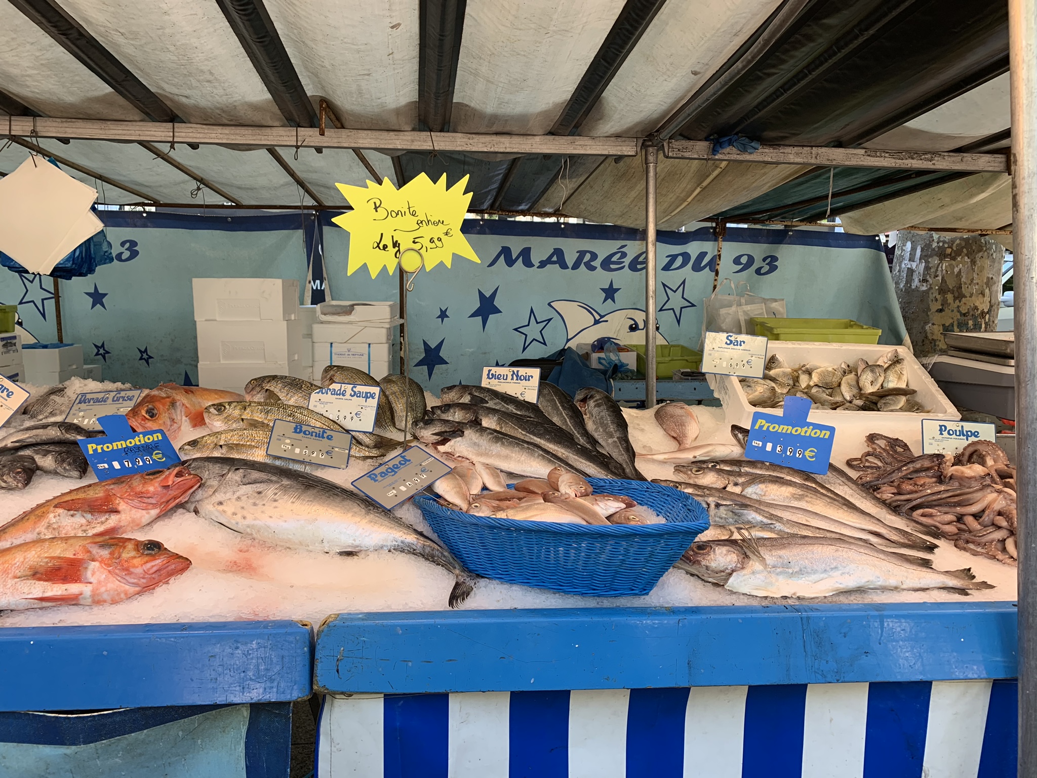 When we arrived, the market was in full swing, from fish stalls to fruits and veg.  Penelope ordered her weekend fruits with confidence, and we took a break mid-way through the market to nosh on a saucisson fromage crepe (Penelope’s current favorite).