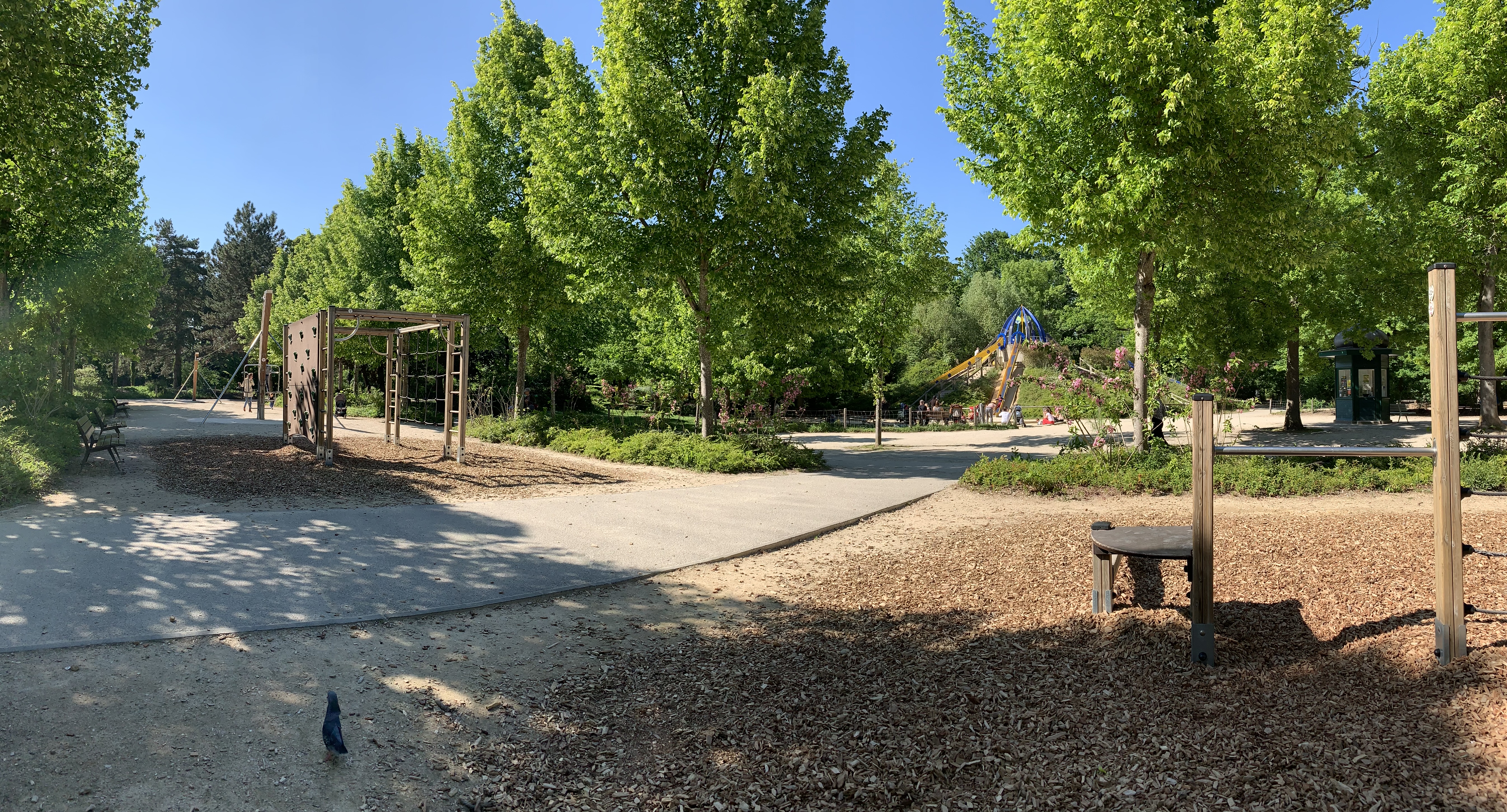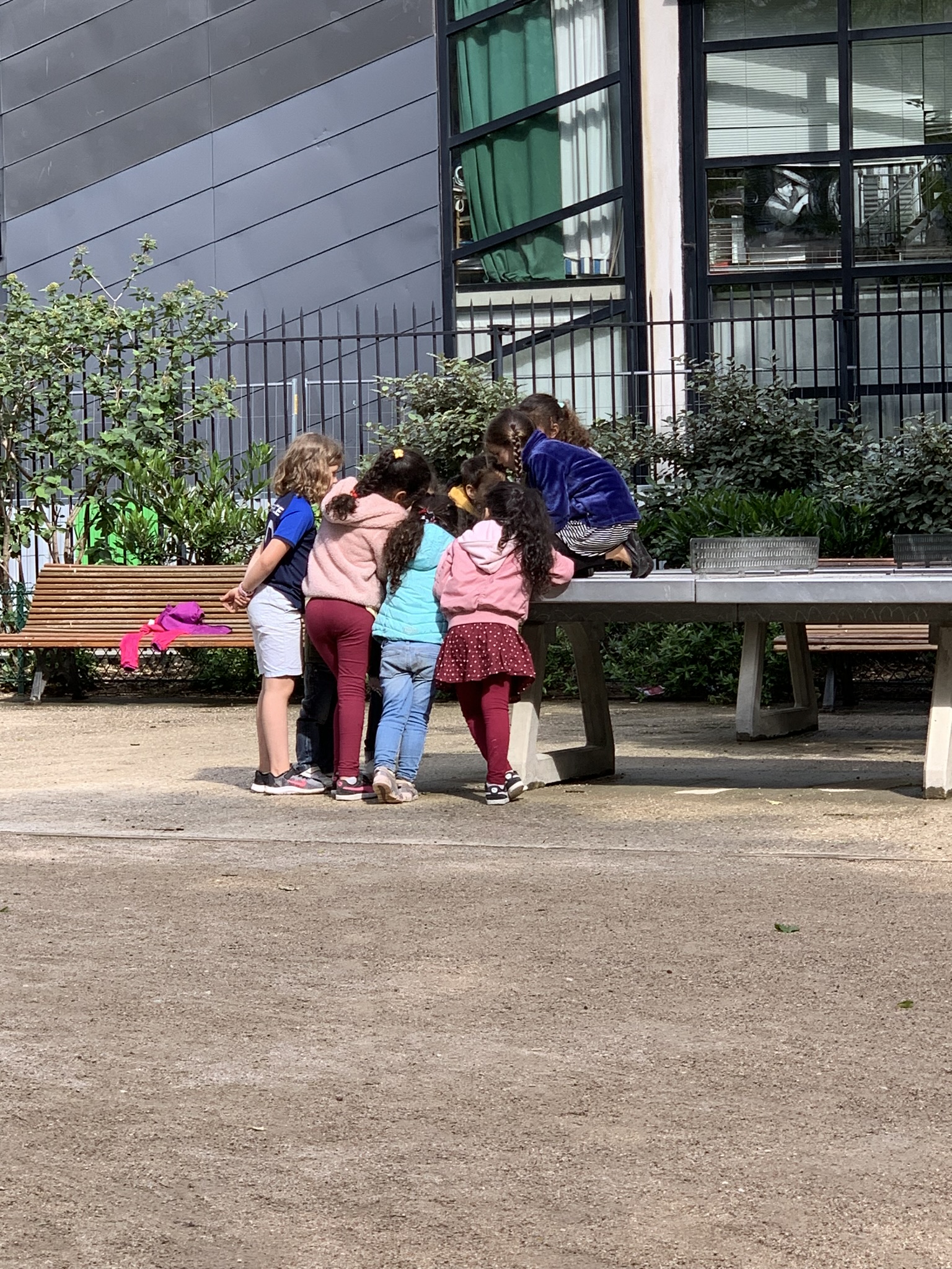 Afterwards, we headed to a nearby park to bask in the rarest of Parisian sights: sunshine!  The rain had ended, and a local school was having recess at the playground—and Penelope delightedly joined in.