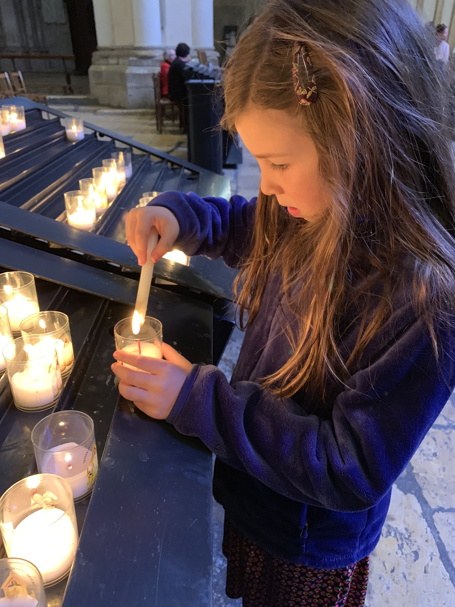 Penelope’s favorite pastime during our church visits: making an offering and lighting a candle.