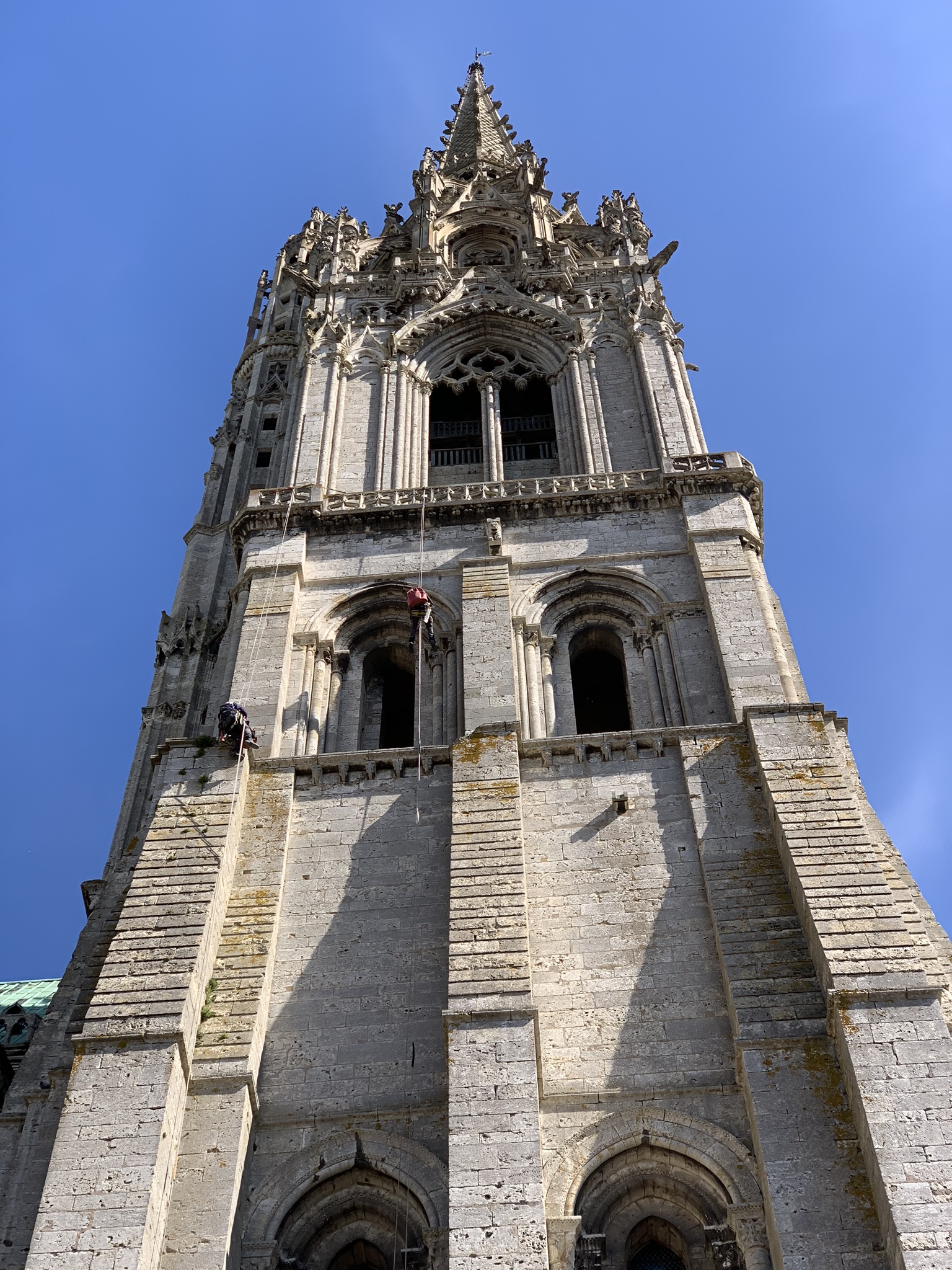 As we finished the tour, we were stunned to see what appeared to be two mountain climbers aloft one of the towers… and then quickly realized that they were cleaning the outside of the cathedral, lifting free debris and moss from the nooks and crannies of the tower.