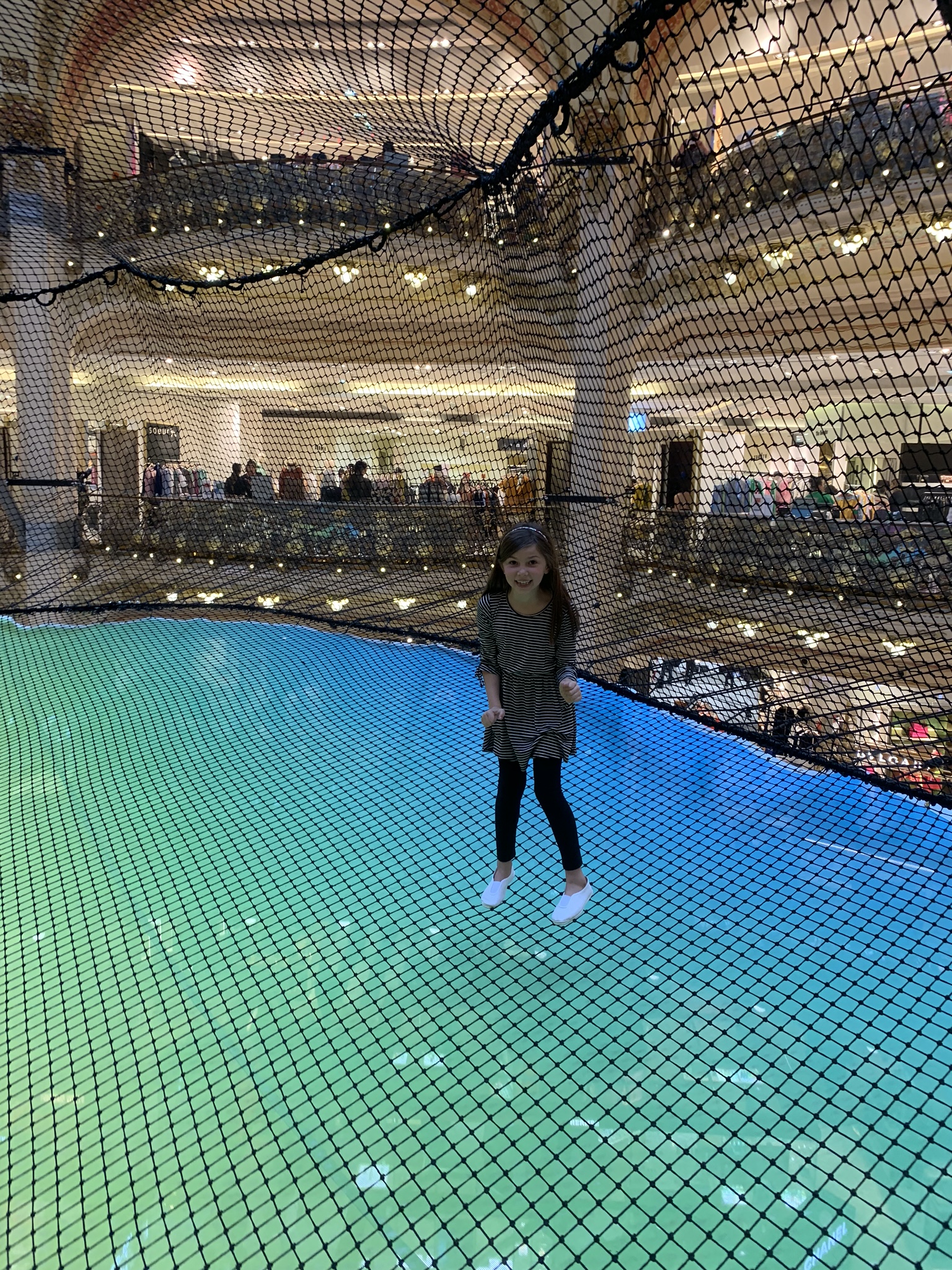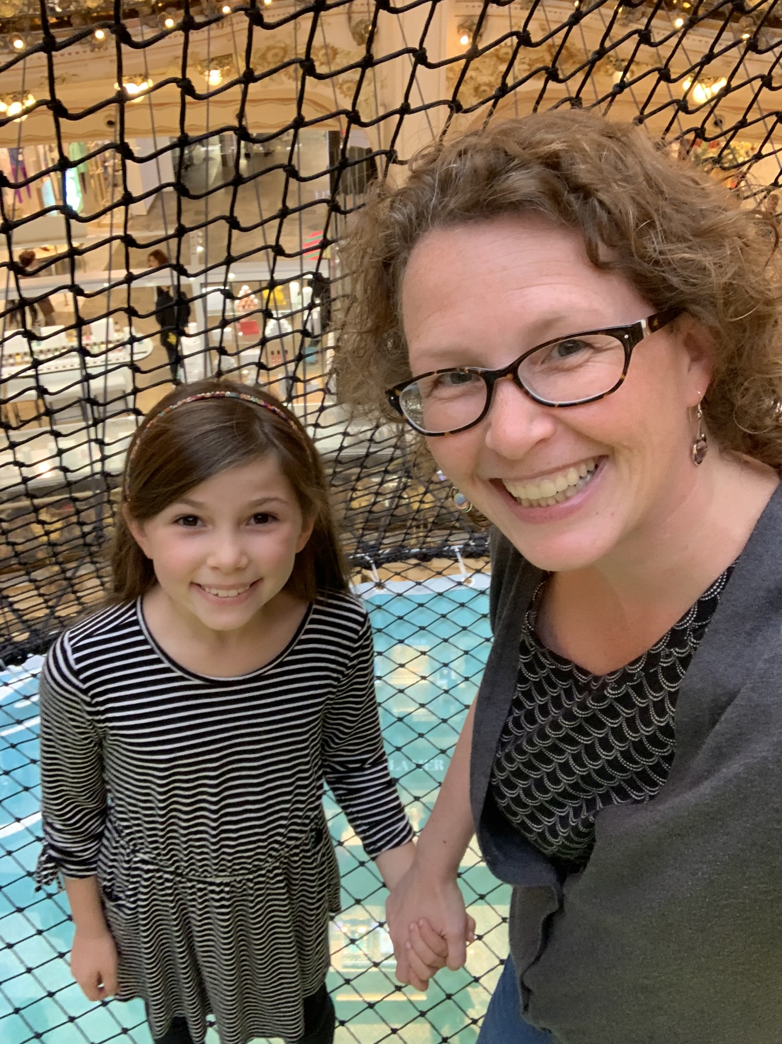 Penelope admiring the mechanism of the elevator at work as we rode to the second level.