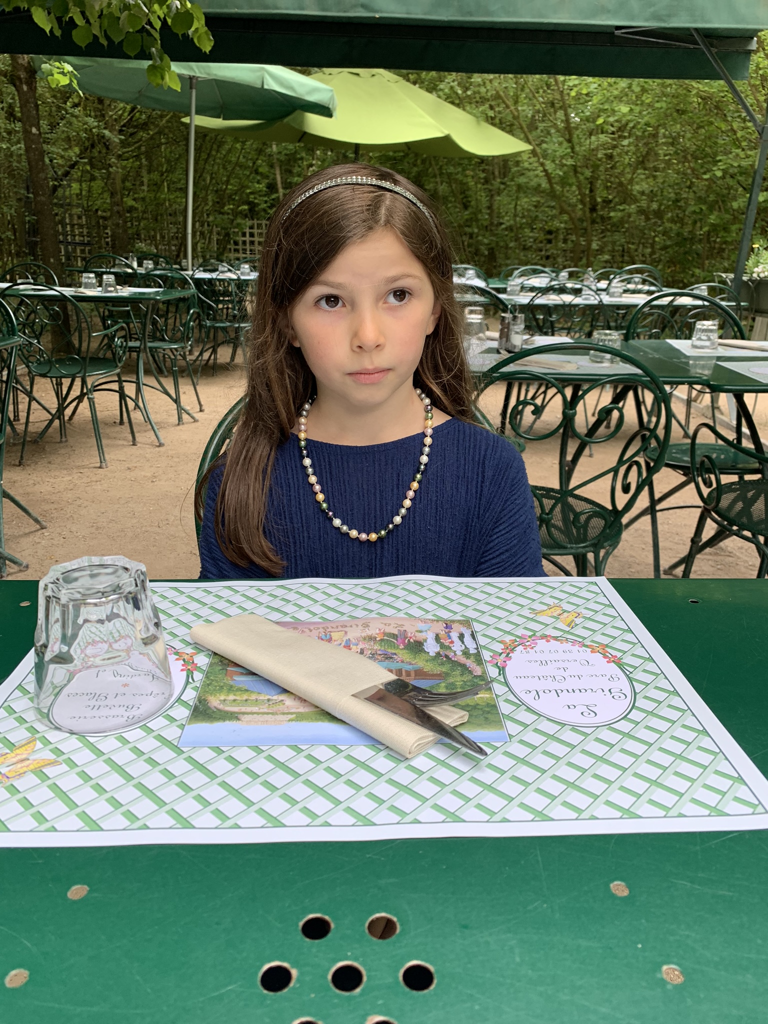 On Tuesday my folks were off to spend the day at the Musee d’Orsay while I started the mammoth task of… packing.  With our flights home just two days away, it was time to see if everything would actually fit back into our suitcases.  Penelope occupied herself with schoolwork and reading (and more screen time than usual) while I sorted and organized and eventually started packing our luggage.  By early evening, when Grandma and Grandpa returned home for dinner, we were about 90% done.  Not bad!  Earlier that day, Penelope and I had walked down the street to select our final pastries from our favorite patisserie.  Each of us chose one… and I added an extra—so we shared the five delights between us.