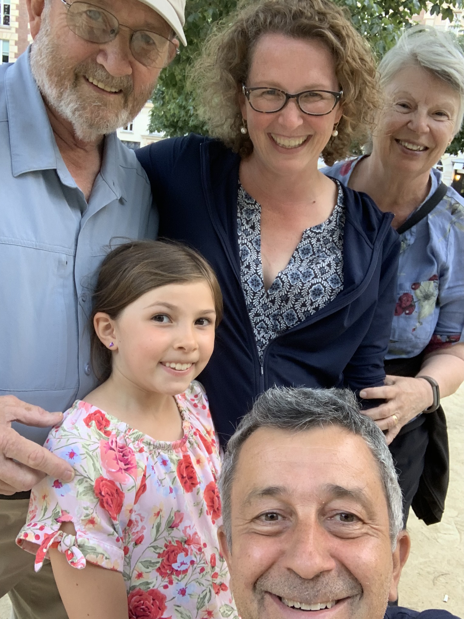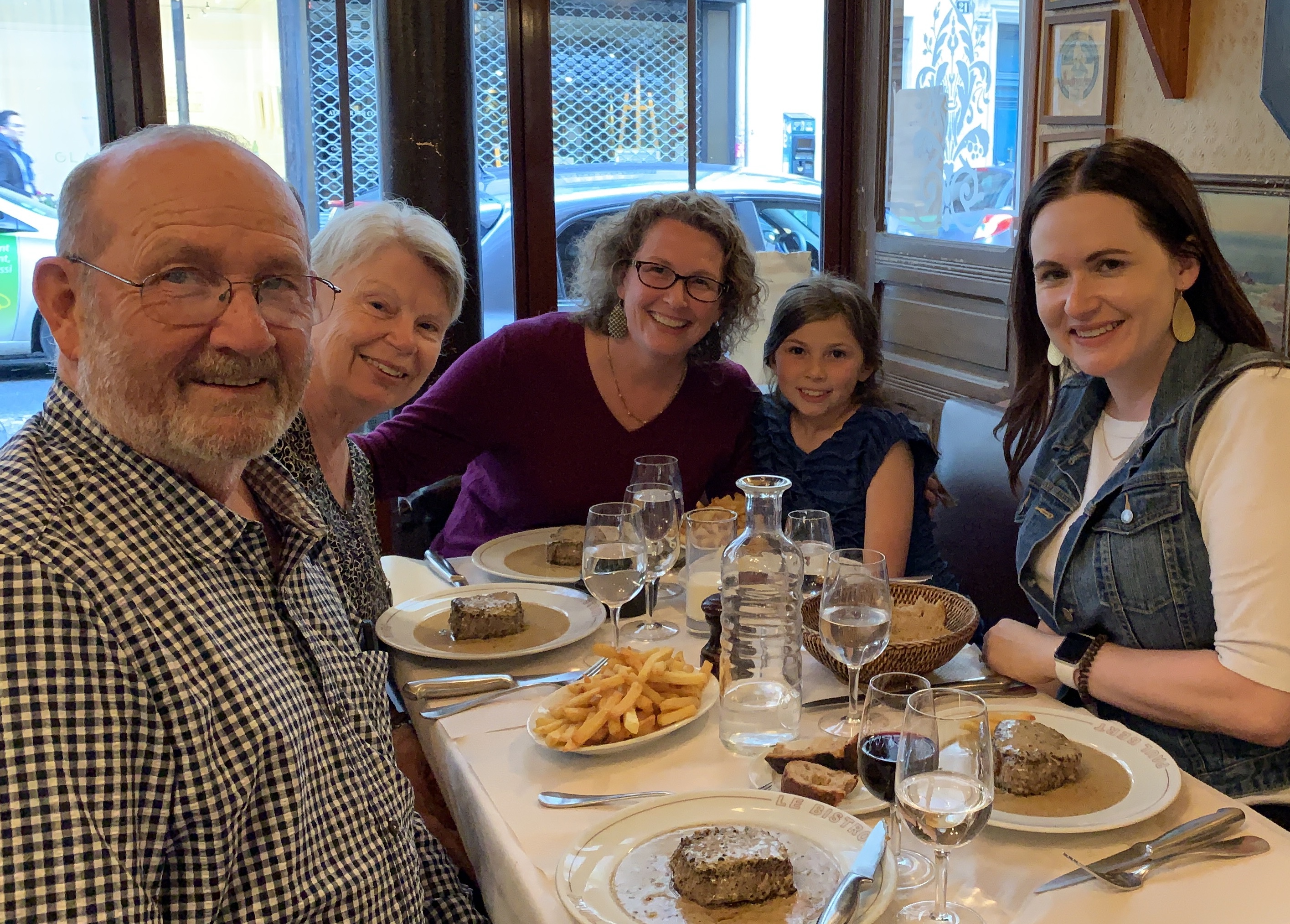 By late afternoon everyone returned to the apartment for a final evening in Paris: last-minute packing and a family dinner.  Tomorrow my parents will return to their camper (parked about an hour away from Paris) and start driving toward their Sunday date with the ferry to England.  They’ll be spending the next two months exploring England and Scotland, ending in an apartment in Edinburgh for the Fringe Festival in August.  And Penelope and I will be homeward-bound!