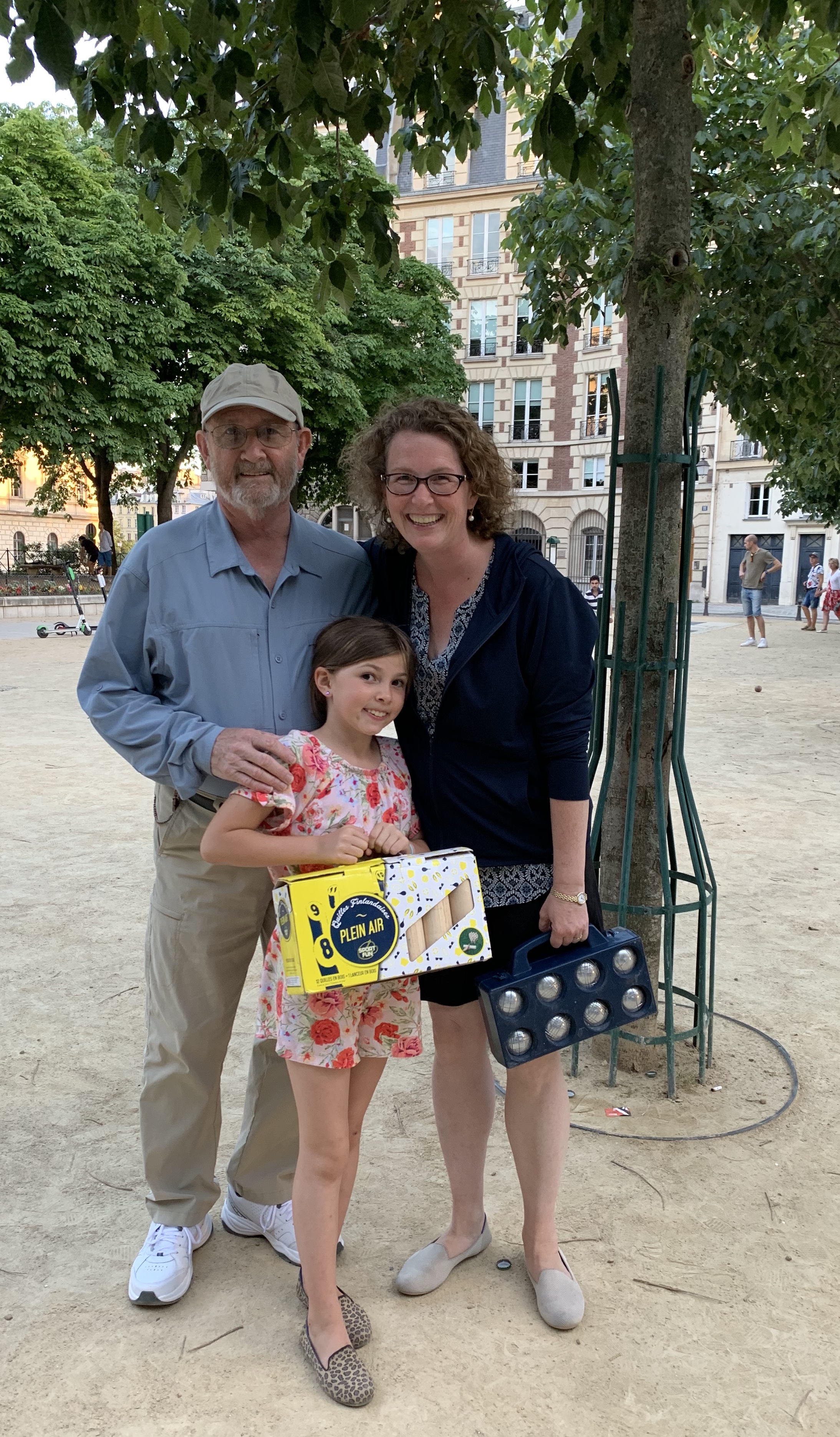 You can’t miss the many groups of people playing petanque or molky in the evenings—or afternoons—they are in just about every Parisian park.  So I’d signed us up for an evening lesson with a local, Arnaud, to teach us the basics of the games.  Penelope and Arnaud formed one team and my dad and I the other—my mother opted for the role of spectator on the nearby bench.