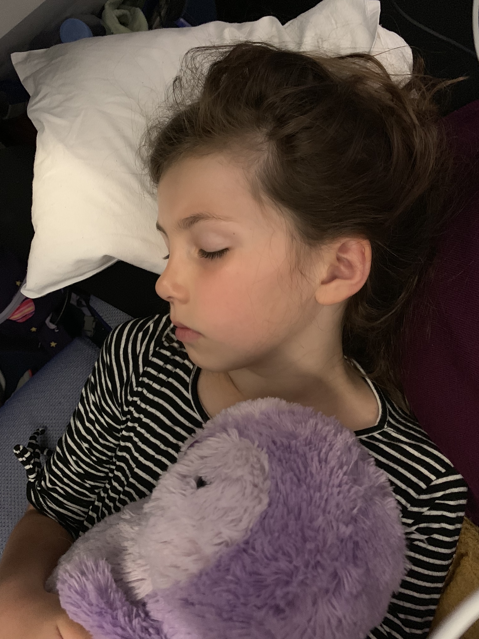 Penelope slept for about three hours, curled up on her seat (and my lap).  Having heroically offered the window seat to my daughter, I, alas, could not sleep.  So I passed the twelve hour flight reading and watching movies (Aquaman: terrible but nice visuals; Dumplin’: loved it! almost as good as the book; and Jumanji: Welcome to the Jungle: mildly amusing).
