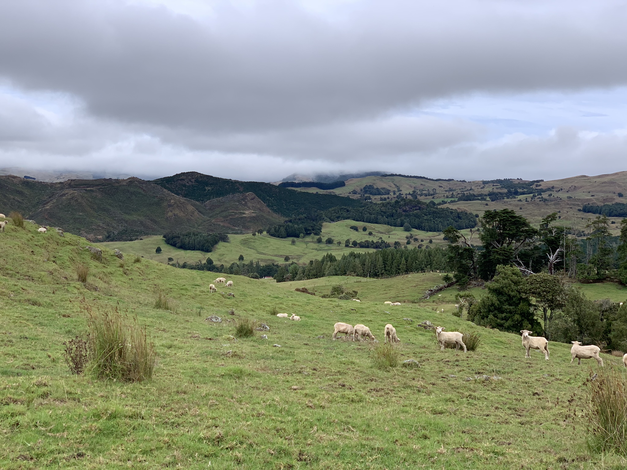 So on Saturday morning we packed up and headed southwest, choosing one of the three routes Google Maps proposed for our consideration. Unfortunately, Google did not indicate that our selection was a logging road, unpaved, and would remain unpaved for most of the drive. The views—forest and hills and lots of sheep—were much appreciated—the road was… not.