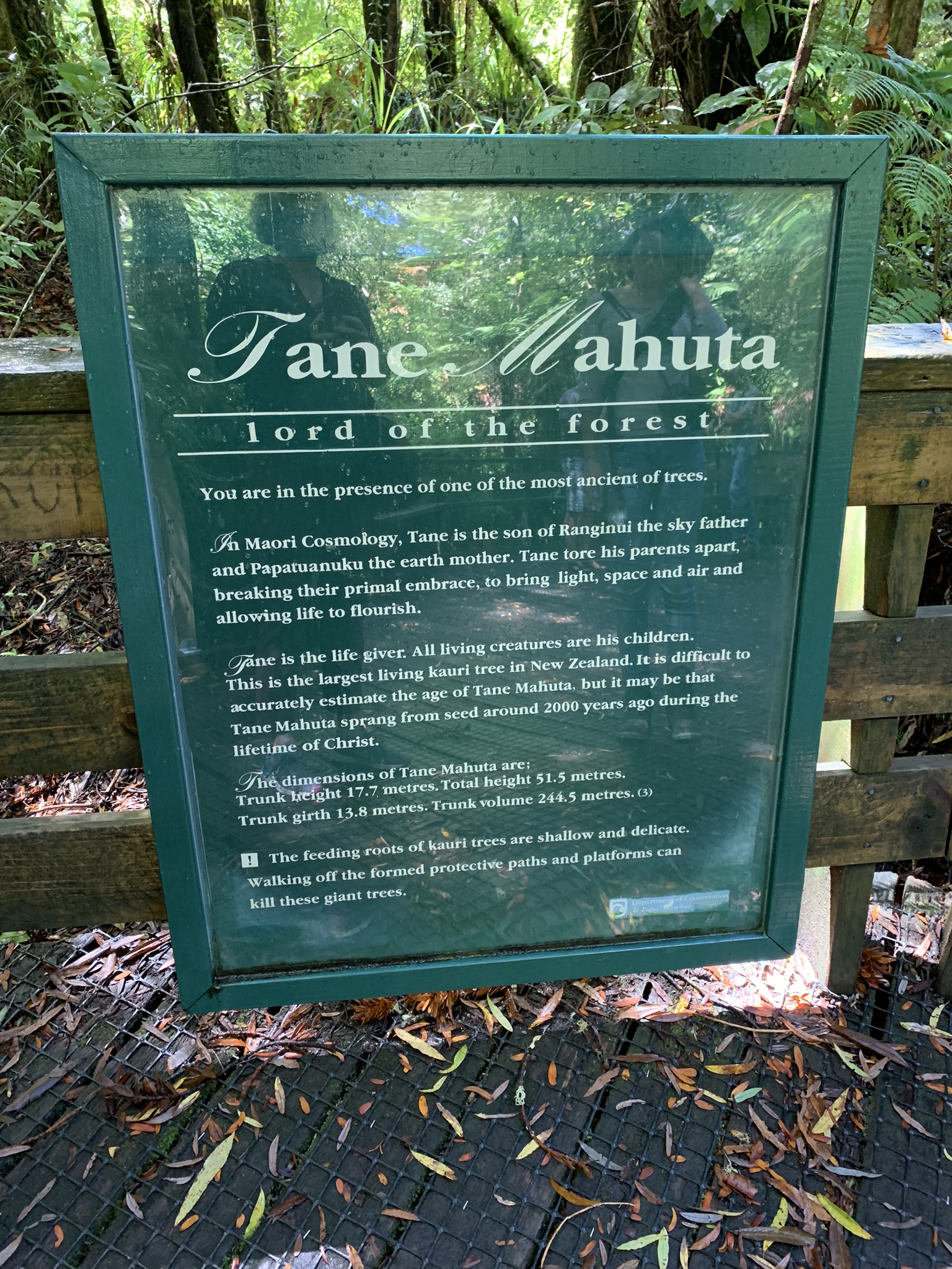Sunday we had a break in the rain in the afternoon, so we seized the opportunity to drive south to a different part of Trounsen Park—to see the very largest kauri. First was Tane Mahuta, Lord of the Forest, which is believed to more than two thousand years old.