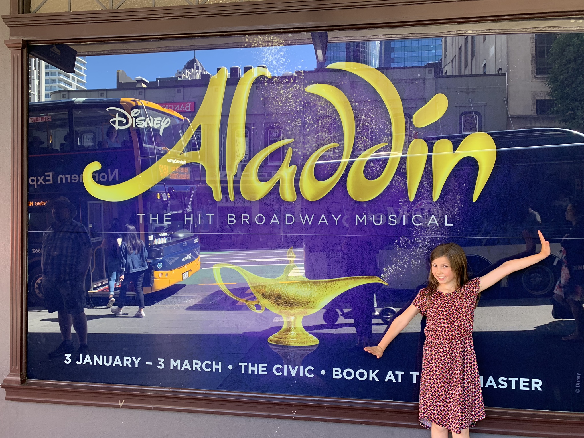 After the Sky Tower, we walked back to our neighborhood to have an early dinner at Tanuki’s Cave, a yakitori restaurant just a block from home. Two thumbs way up—fabulous food! Then Penelope and I were ready for our girls’ night out: we had tickets to see the musical production of Aladdin. Penelope had really wanted to see the musical when it came to San Francisco last night, but the prices rivaled those for Hamilton, so we’d opted not to go. While in Wellington a few weeks ago, Penelope caught sight of an ad for the Auckland production, and I’d checked the prices… and they were so much less expensive that we decided it’d be a fun night out for our final days in New Zealand.