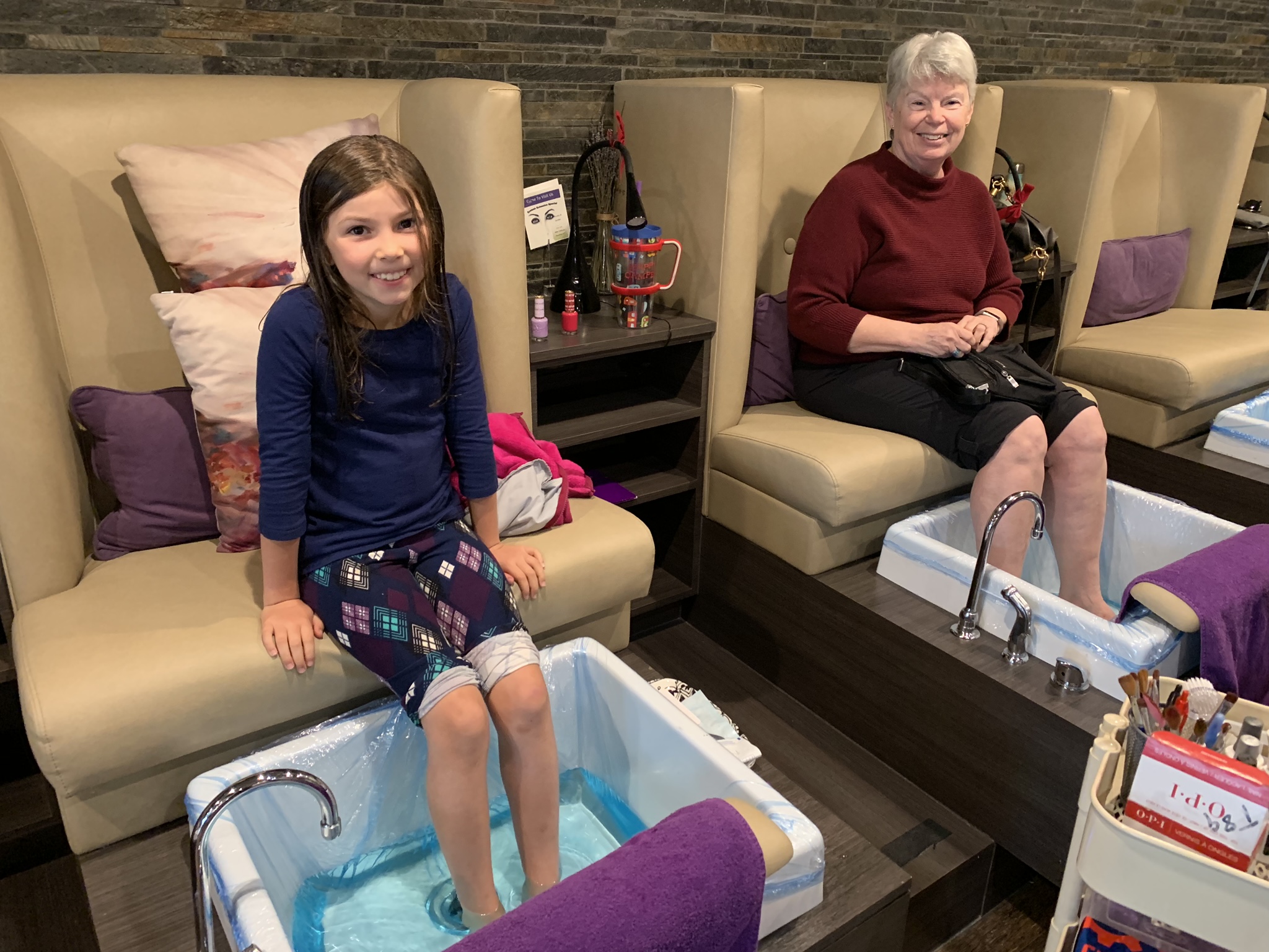 And then it was time to buckle down to packing for our next journey. In the midst of considering jacket options and finding Penelope’s Italian phrasebook (proudly purchased with her allowance), we made time for a mani-pedi at the salon. Penelope was thrilled to have a foot bath just like Mama and Grandma—but hastens to add that she was the only one offered a special flower design on her pedicure. 🙂