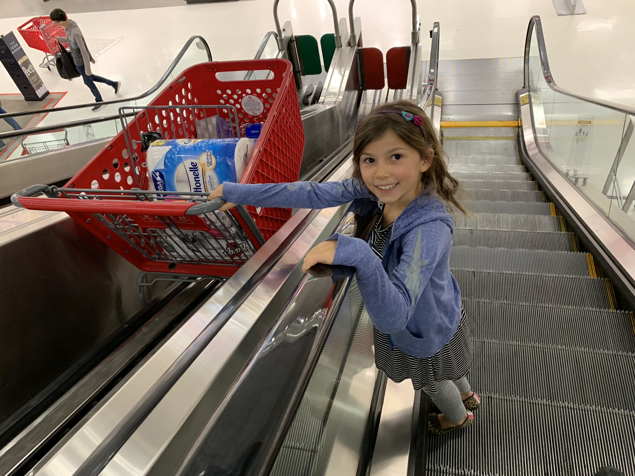 Penelope was equally delighted by her visit to a two-story Target in San Jose, where she encountered the exotic sight of a shopping cart escalator for the first time…. who needs to travel abroad to find such wonders? 🙂