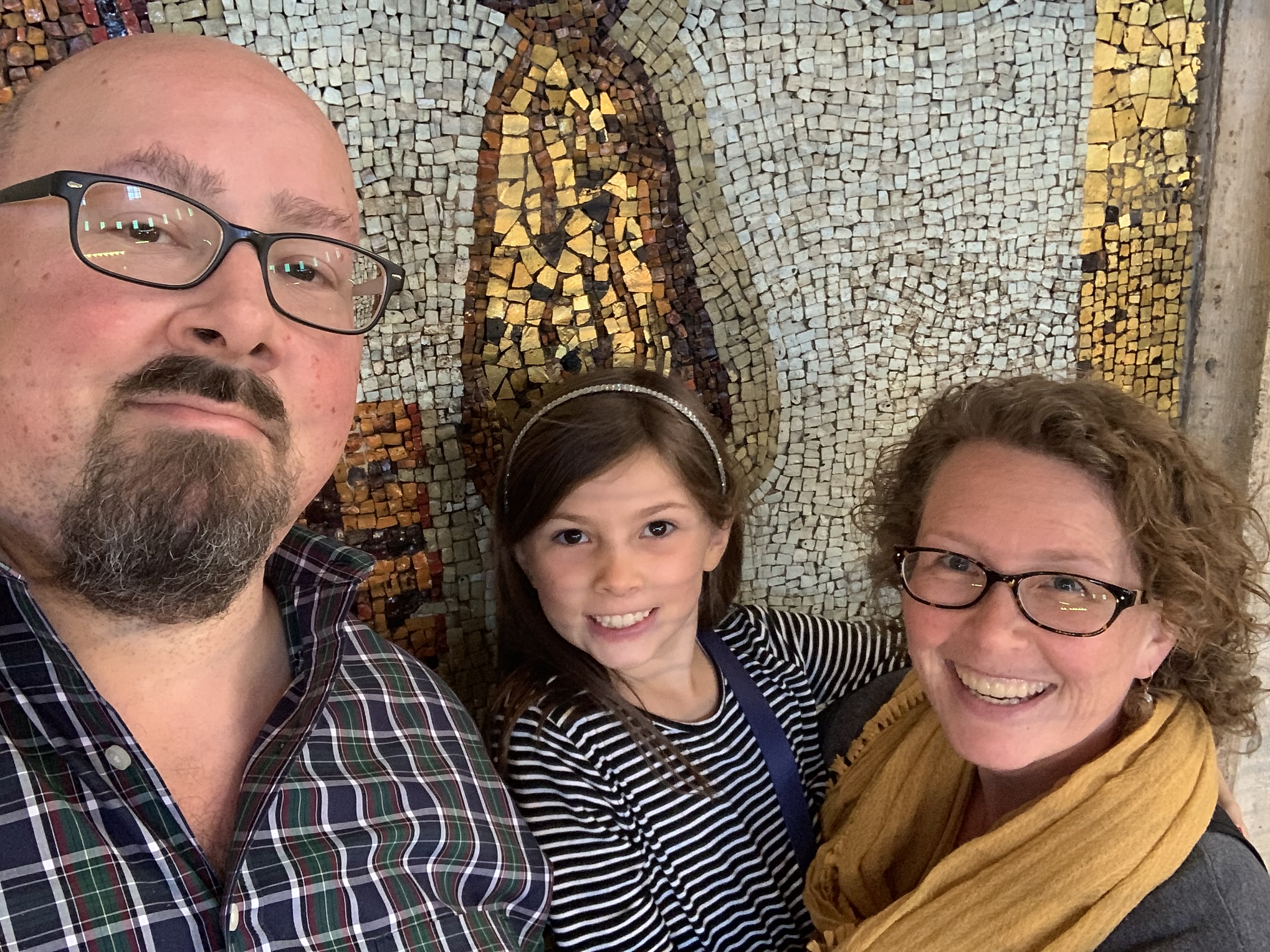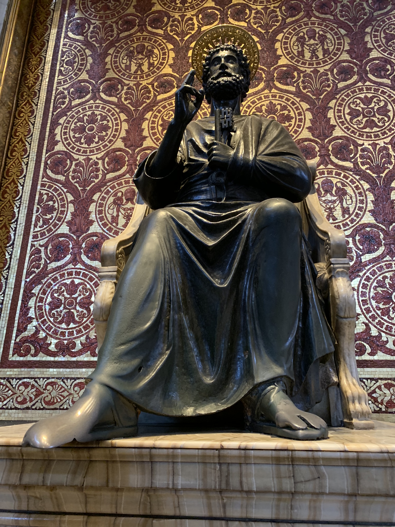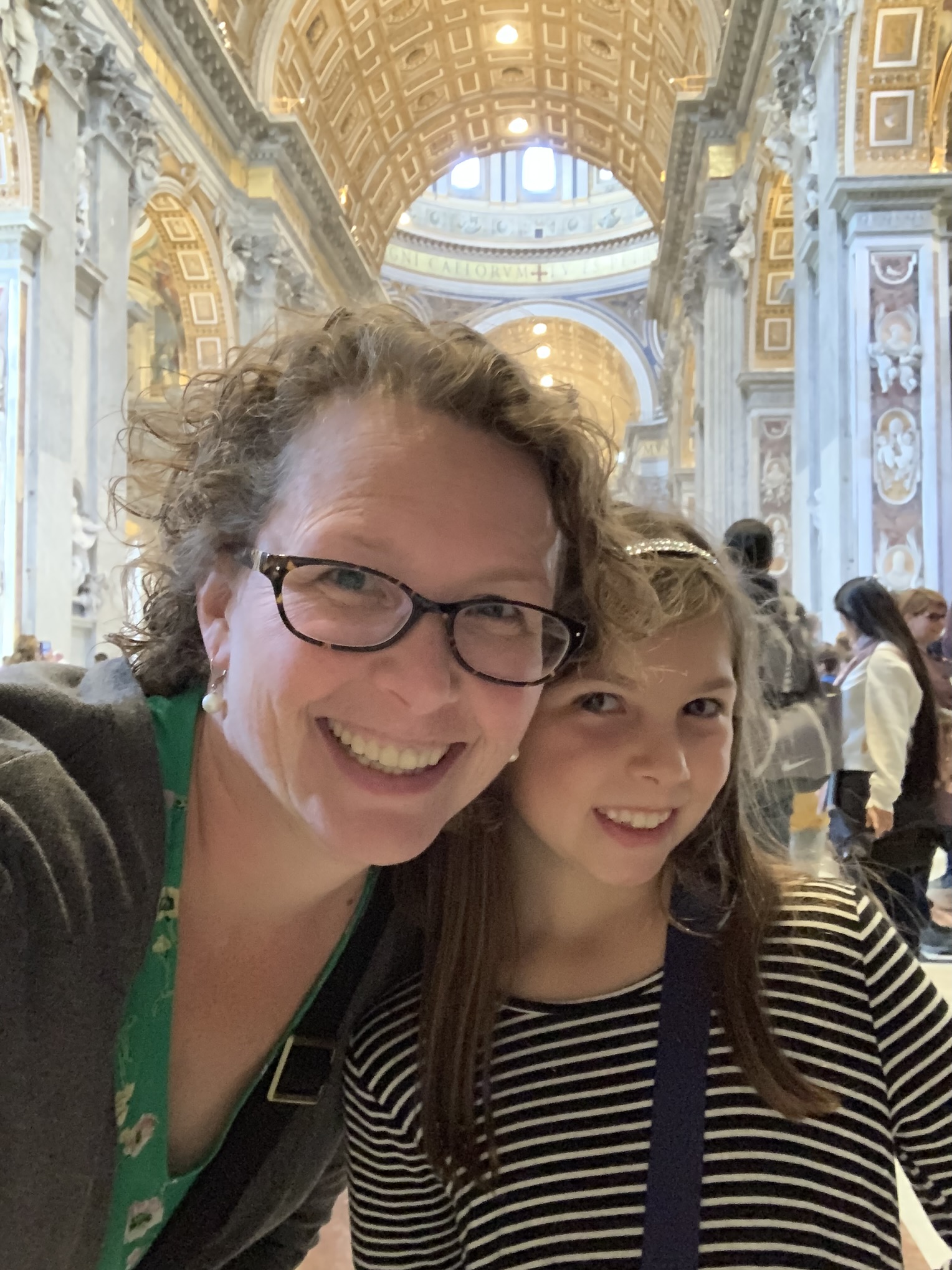 Jeremy opted to listen to the Rick Steves’ audioguide (there’s a great free app, with all of his walks and tours narrated), while Penelope and I strolled together and I read aloud selections from the paper guidebook. The church is simply enormous—hard to process just how big, even when standing inside. Having just finished reading the children’s Bible, the newly-acculturated Penelope was quick to identify many of the images around us, from Noah’s dove to Mary holding Jesus after his death (aka Michelangelo’s Pieta). It was fun to see her so excited when she recognized these symbols—the great joy of understanding cultural allusions. 🙂