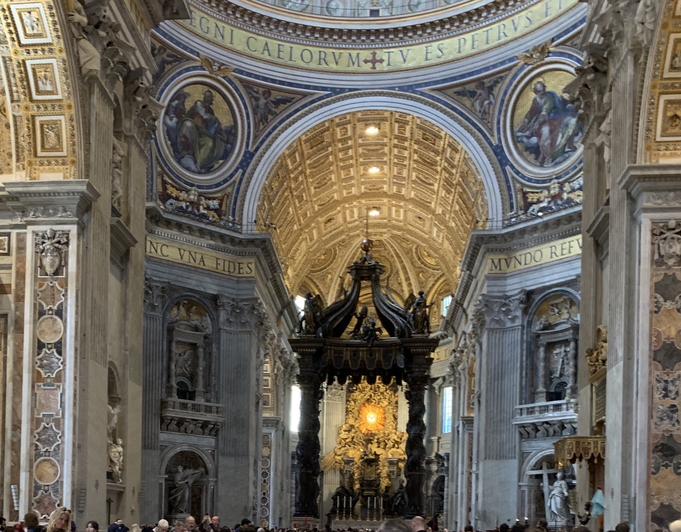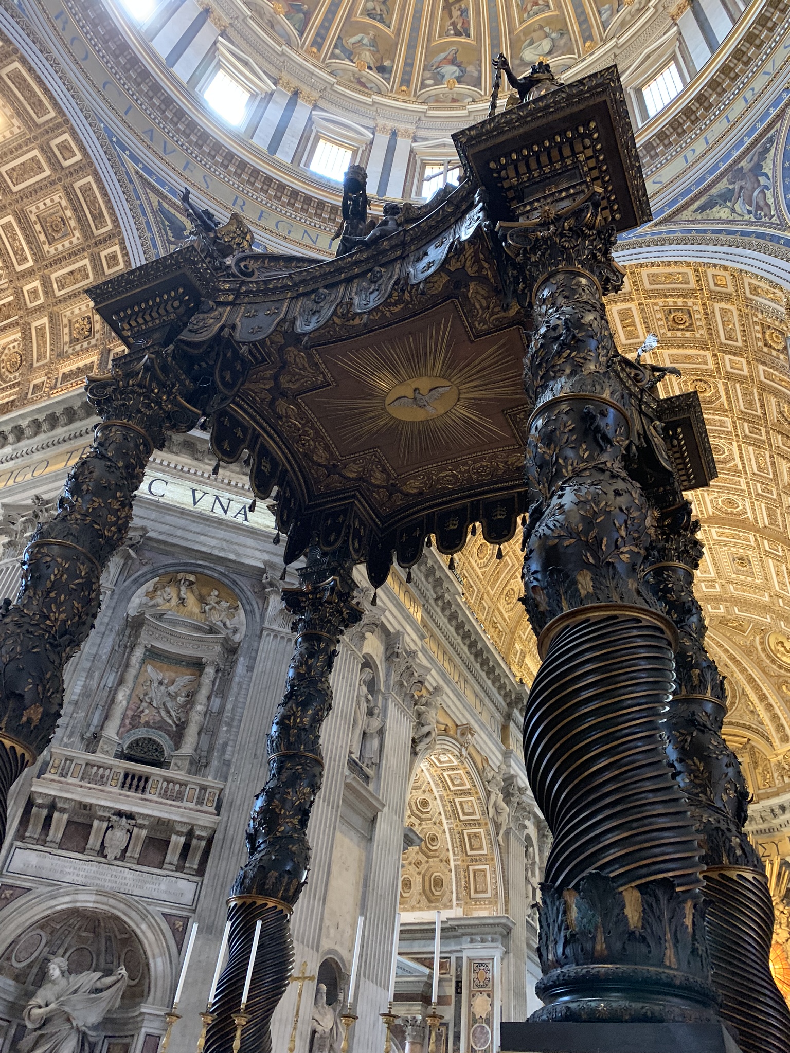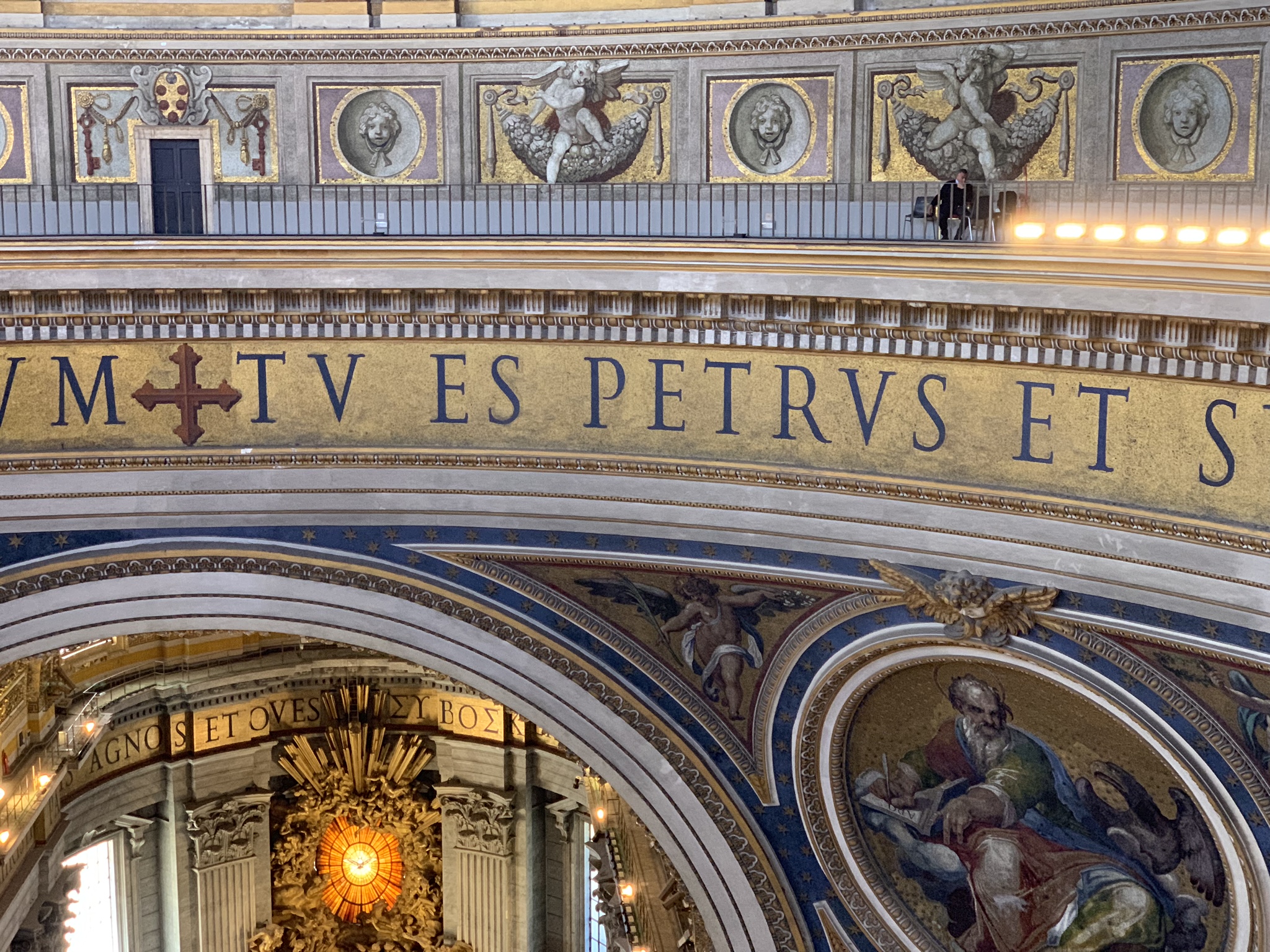 Saturday morning we headed back to the Vatican, this time for a visit to St. Peter’s Basilica. As soon as we arrived, we were immediately accosted by “tour guides” and “information agents” who asked with urgency, “Do you already have your tickets? You don’t want to wait in that two-three hour line only to have no tickets!” Even as an experienced visitor who’d read her guidebook, I had a pang of doubt… but, bolstered by my surety that we didn’t need tickets to visit St. Peter’s, we joined the impressive queue. Only 17 minutes later, we arrived at the front of the line, passed through security, and headed inside. The lines do look daunting, but they really aren’t that bad. Just inside, Penelope and I paused to take a picture looking down the nave.