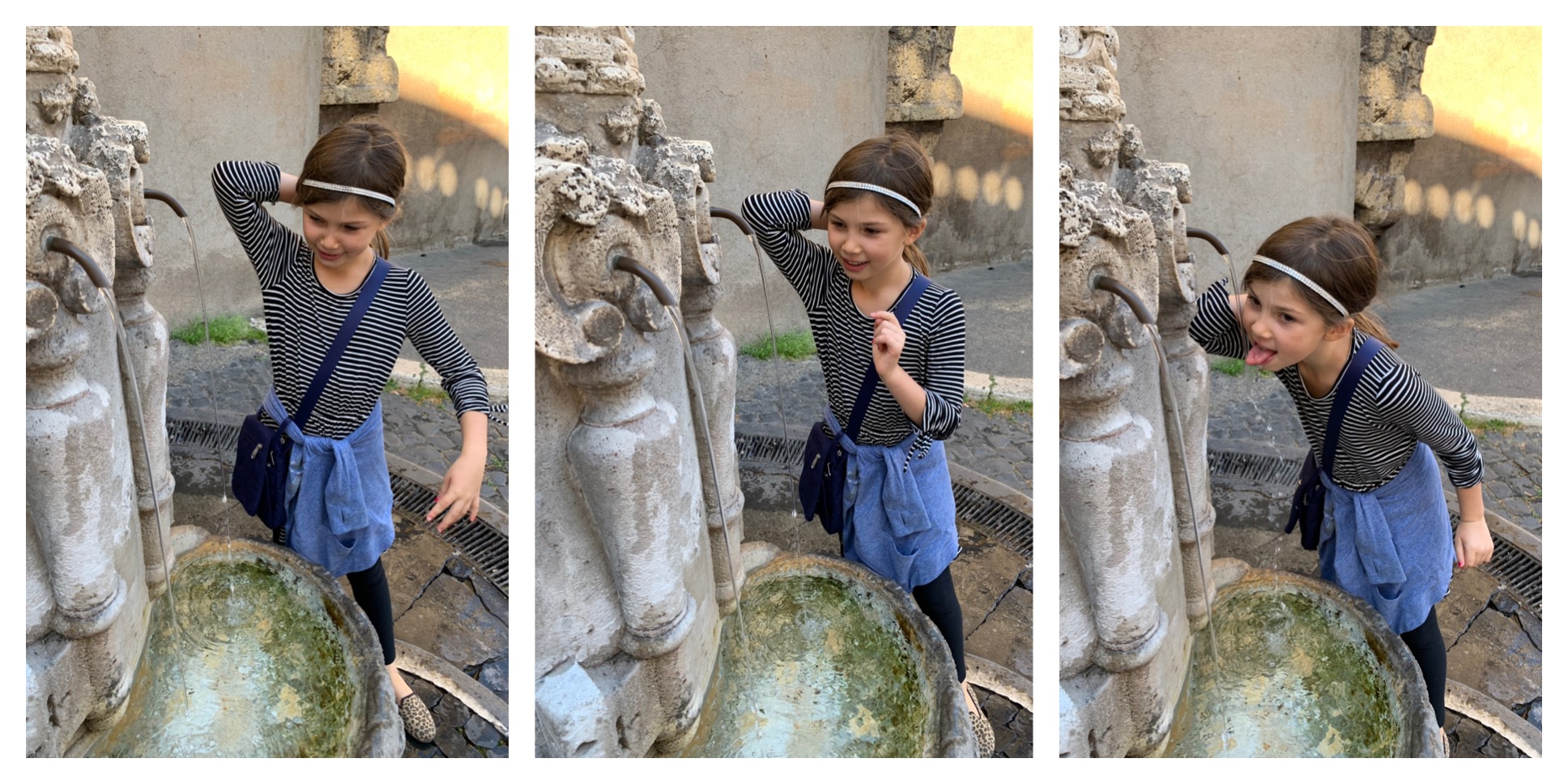 We took the elevator back down to the ground, walked across the square, and stopped at one of the many small fountains to have a refreshing drink of water. Having forgotten our water bottles, this involved some wet shoes as well.