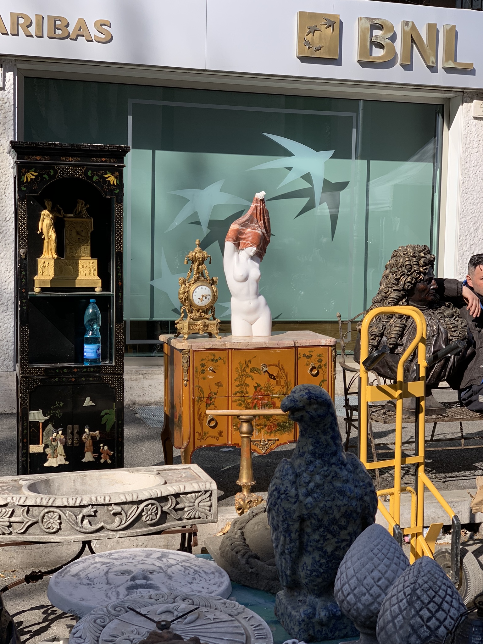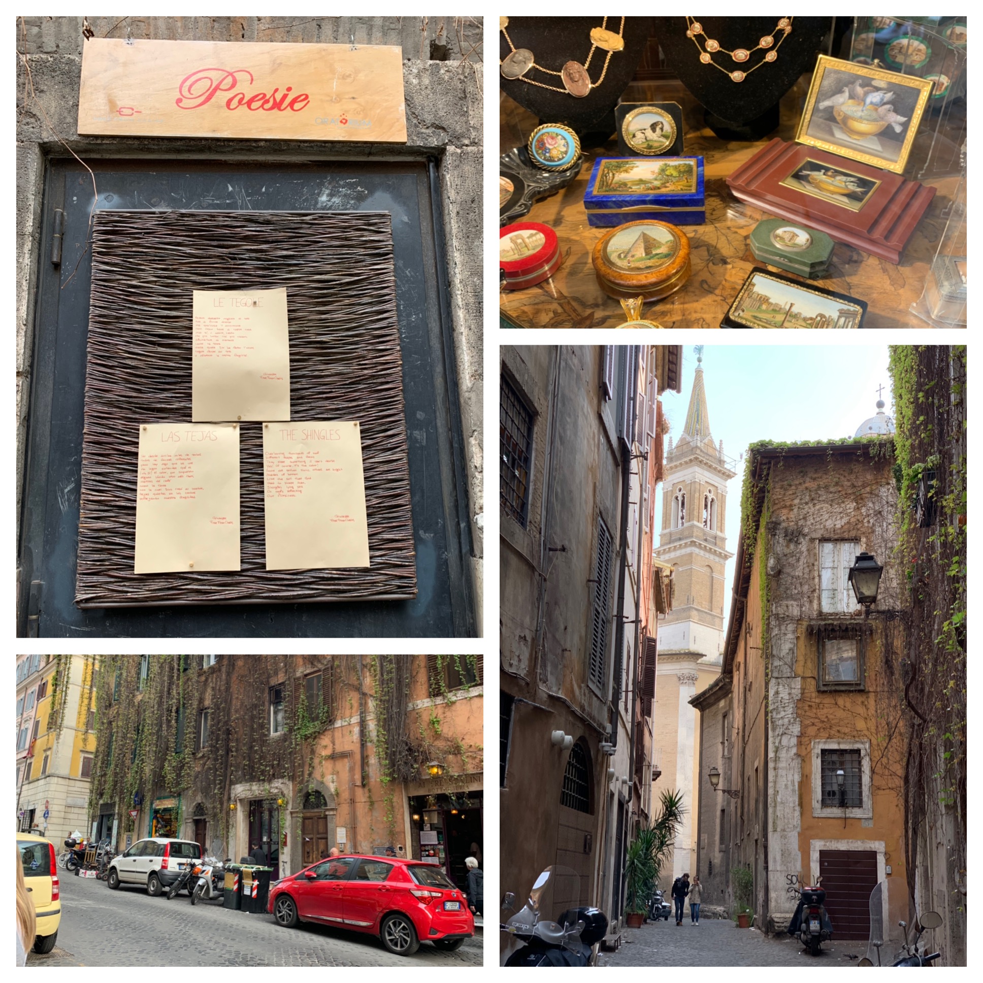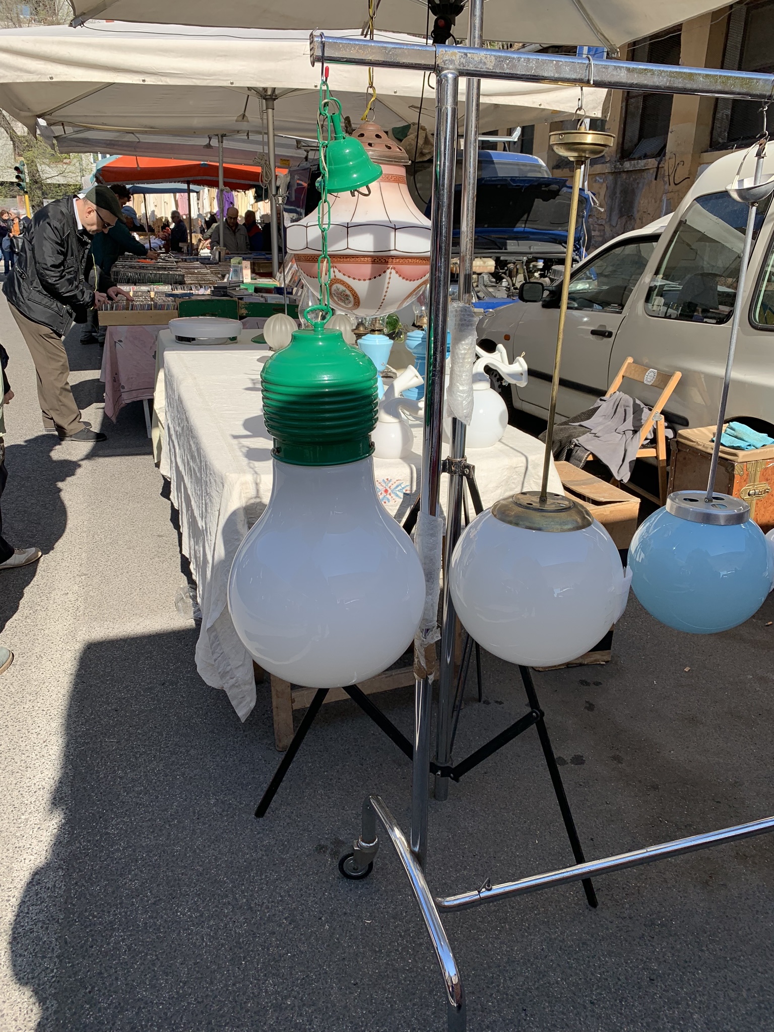 On Sunday my folks had planned to come back into the city for the day, so Penelope and I met them in the morning at the positively enormous Trastevere Market. By far the largest temporary market I’ve ever been to—a wonderful mix of antiques, clothes, knickknacks, household goods, and junk. Penelope found two necklaces on various 1 euro tables, while I purchased three scarves from two different dealers. Penelope announced that I now have enough scarves for a lifetime. I demurred, suggesting I might now have an adequate number for this trip. I could easily have spent several more hours browsing the stalls!