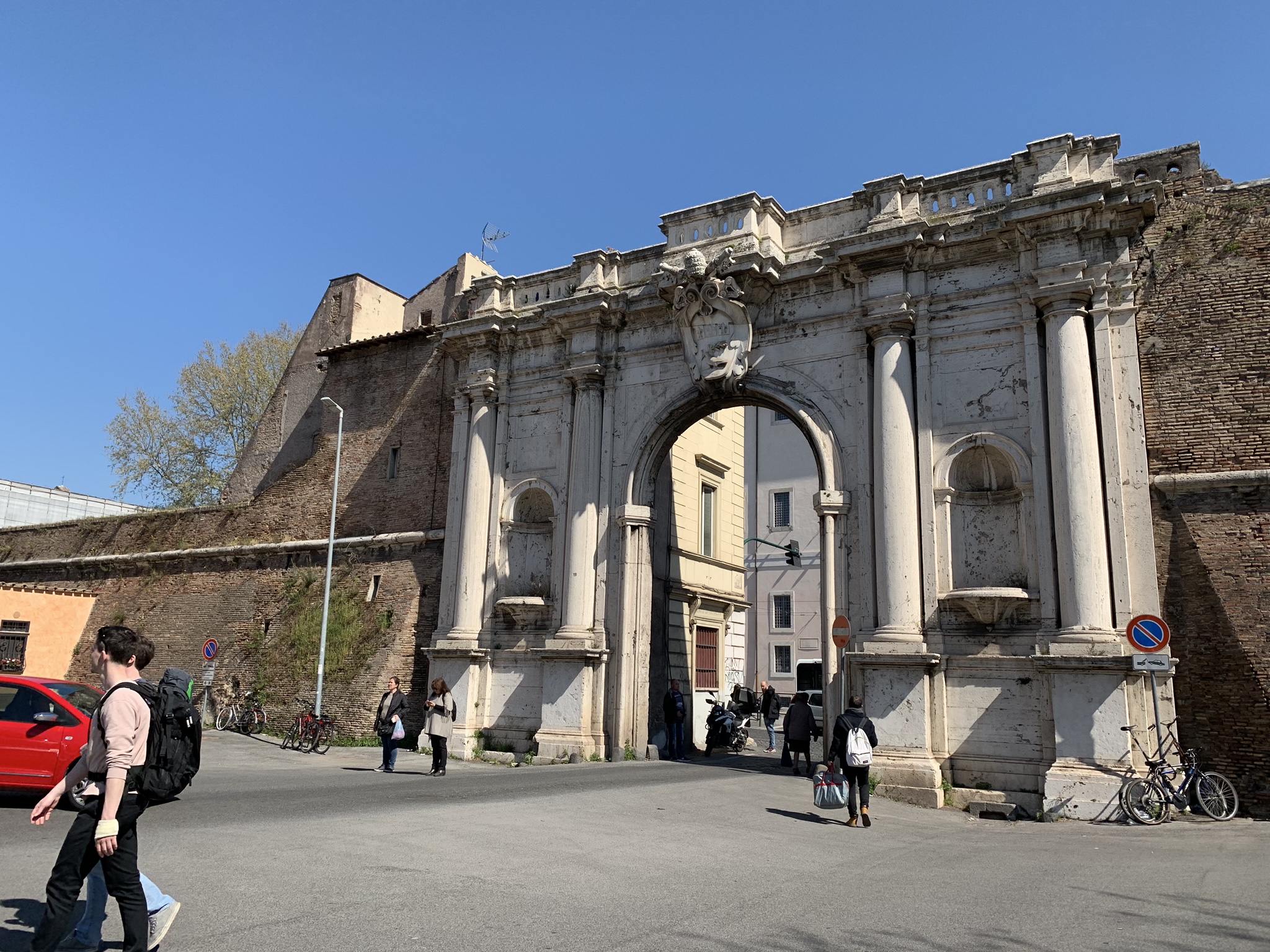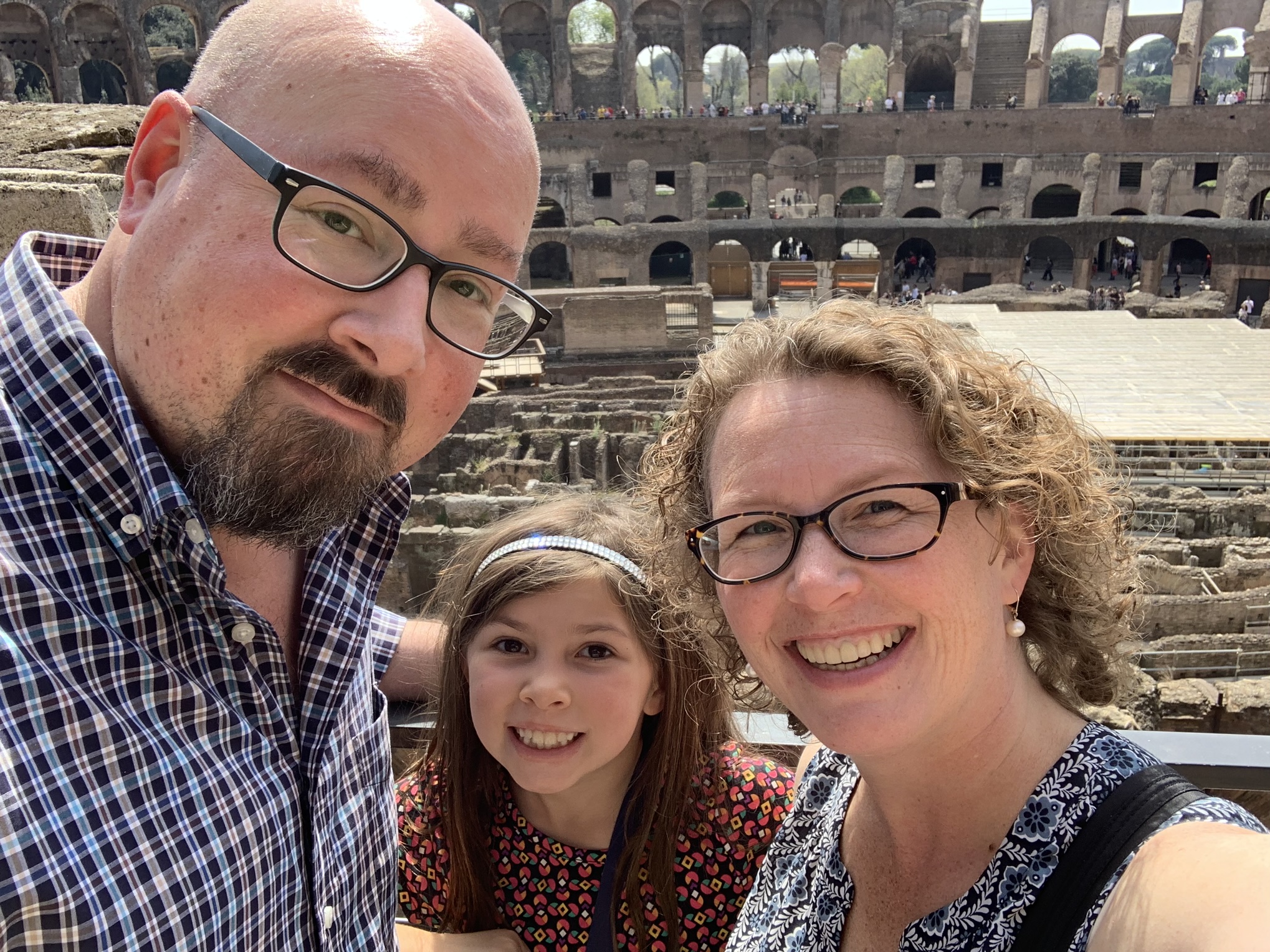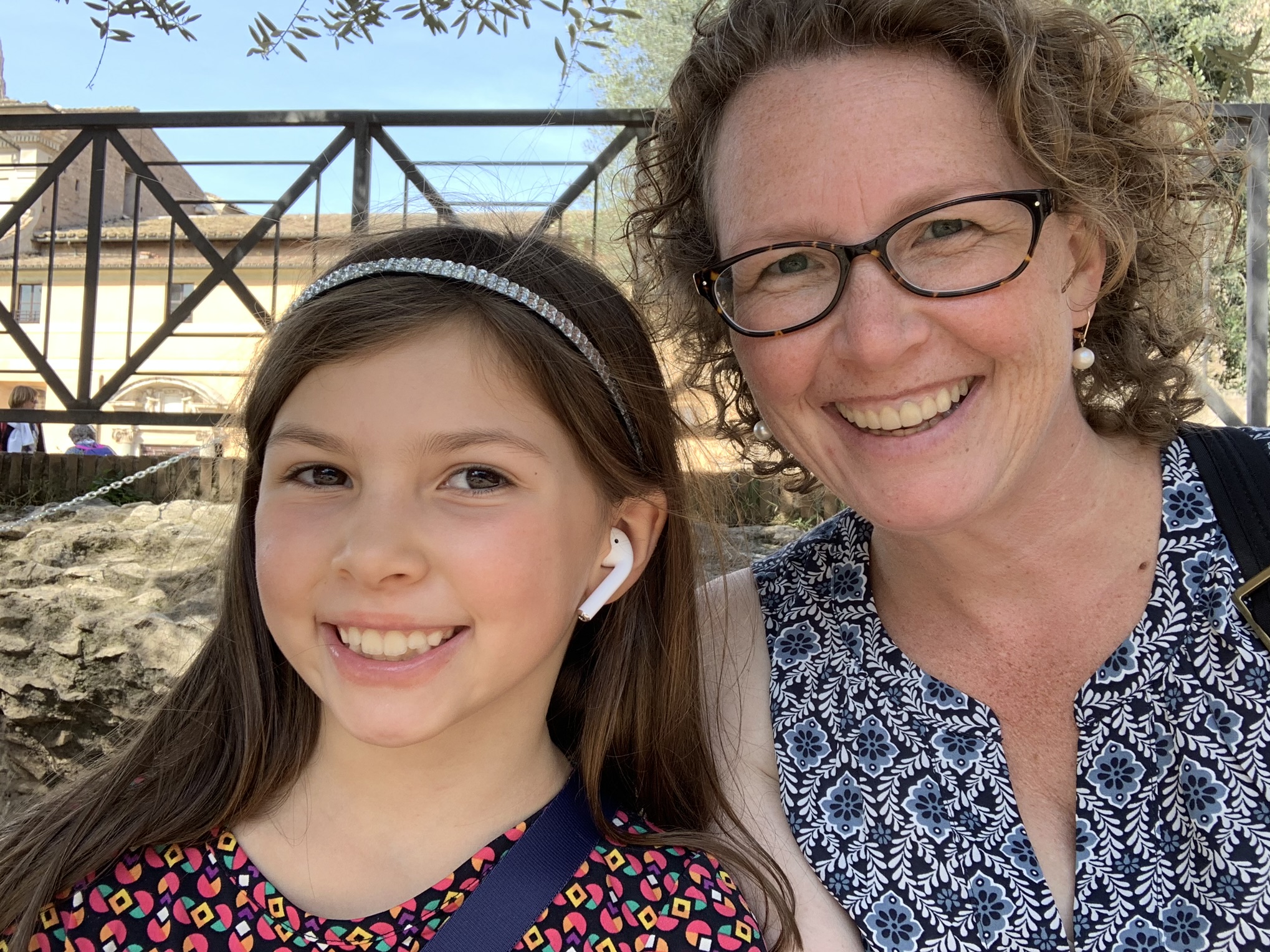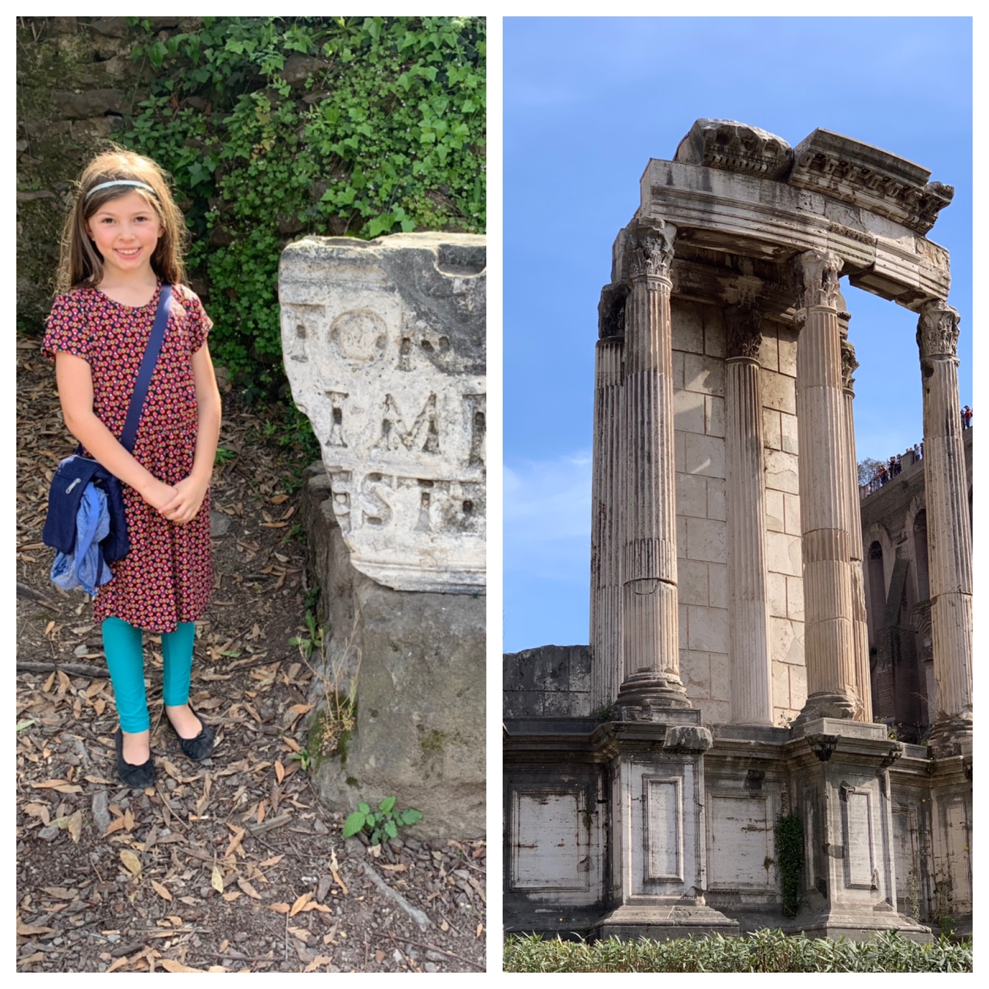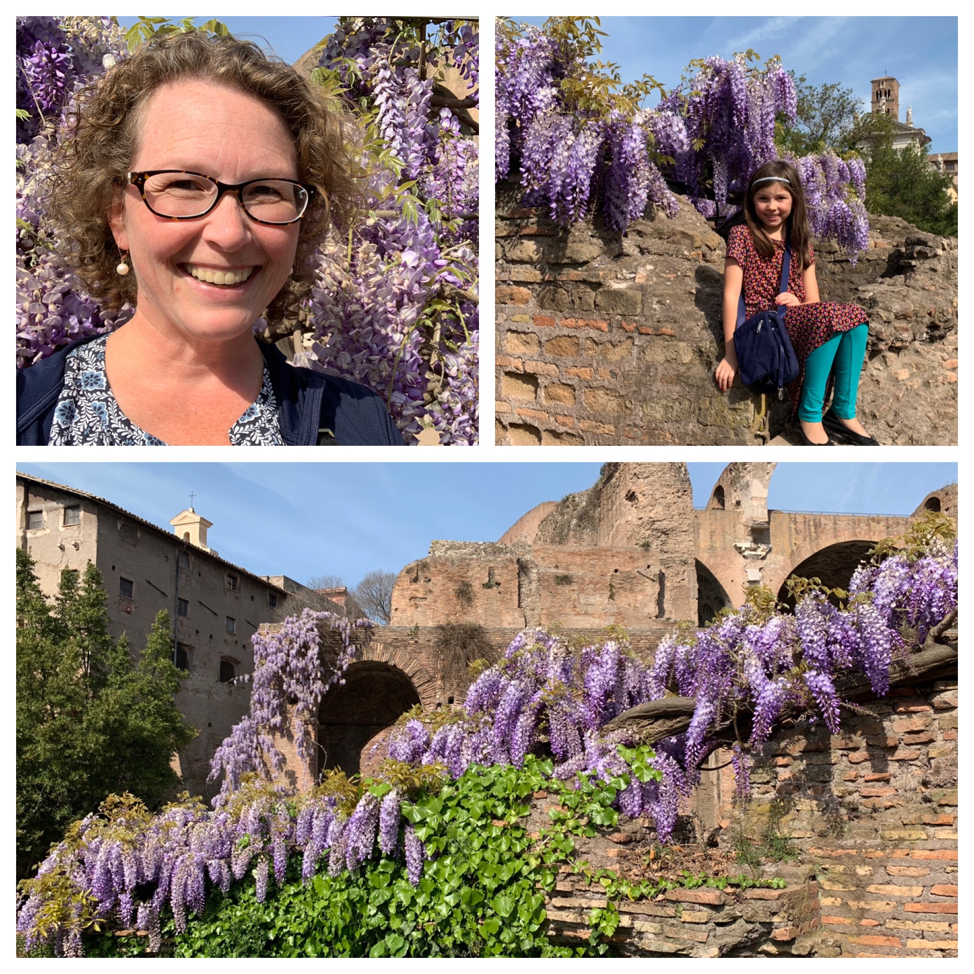 After climbing on top of as many pillars as possible, we left the Colosseum and walked just a few steps over to the Roman Forum. This time we decided to all listen to the audioguide, with Penelope using one of my AirPods. She was quite thrilled by the chance to listen like the grownups, and we all really enjoyed the tour of the Forum. And the just-blooming wisteria were absolutely lovely. A definite benefit to touring these ruins in the spring!