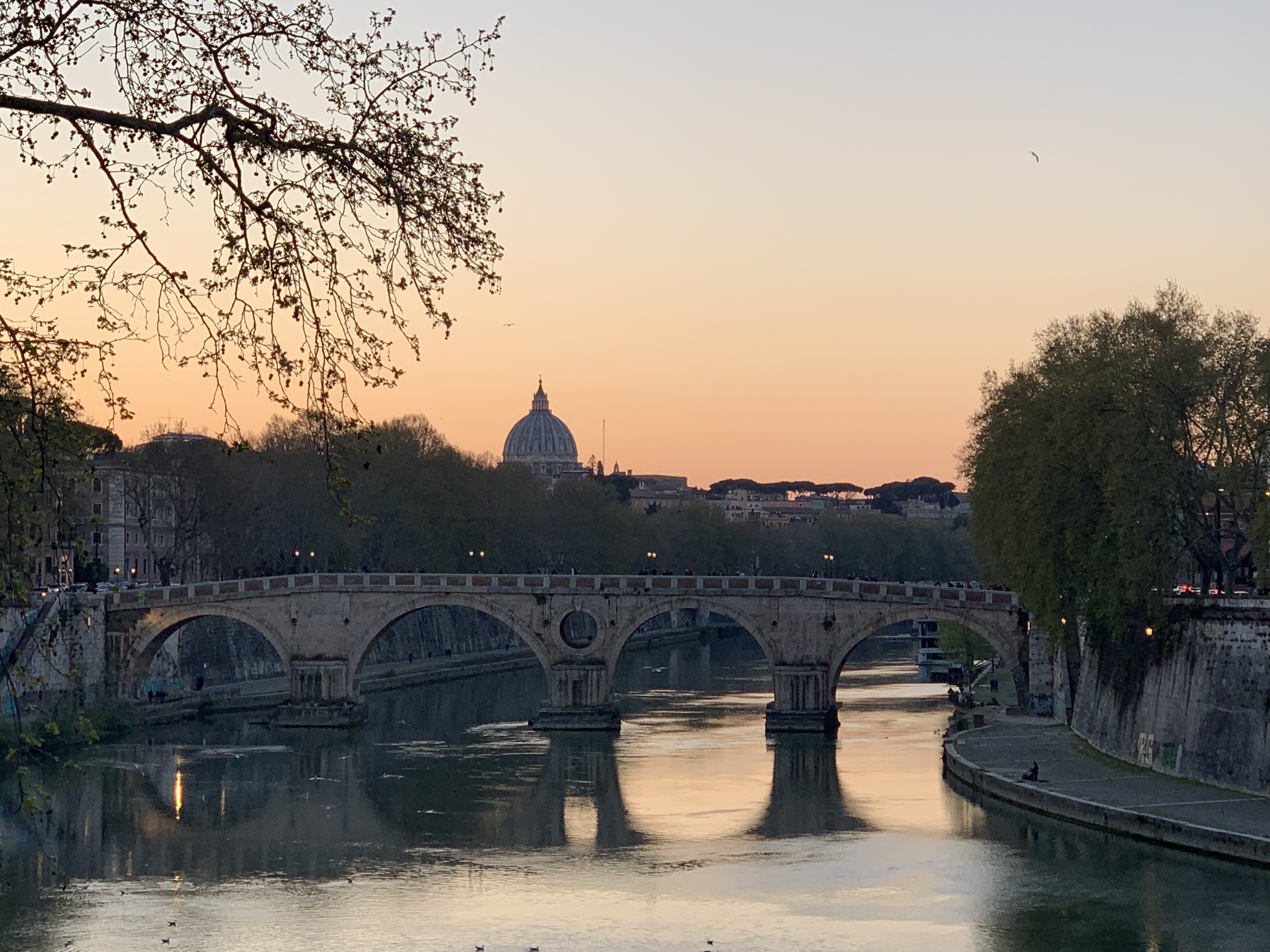 We all met up again at the apartment, where the grandparents were wilting (being a few days behind us in jet lag adjustment). They soon departed to their camper in the burbs, and Penelope, Jeremy, and I opted to eat out. Thanks to a recommendation from a former student (and now colleague!) at Castilleja, we had an excellent choice in mind: Dar Poeta. A lovely sunset view across the Tiber as we walked to dinner, and it was Penelope who identified the dome in the distance. 🙂