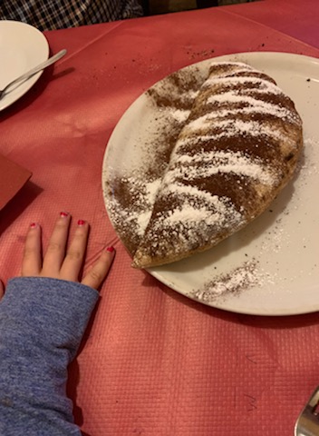 Dinner was amazing. We all ordered pizza, though I proclaim mine was the best: diavola con salsiccia. Jeremy, after sampling a slice of my pie, concurred. Penelope did not, sticking firmly to her own classic choice: margherita. Dessert, as recommended by Elke, was the absolutely enormous nutella and ricotta calzone.