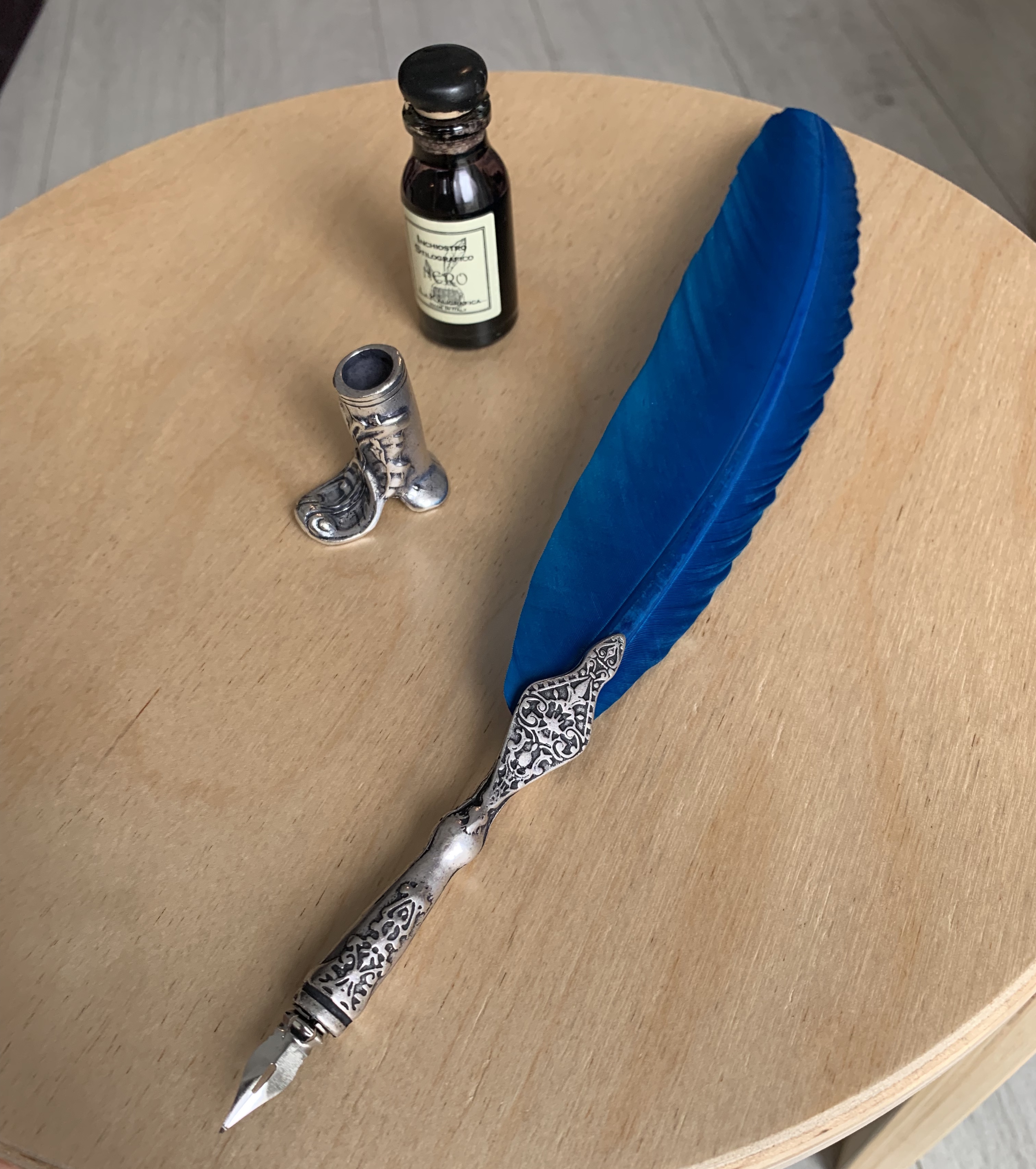 We also stopped by a store in our neighborhood that I’d been eyeing: stationery! Always one of my favorite kinds of shopping. I chose a gorgeous leather pencil case, and Penelope dipped into her savings to buy a lovely blue feather pen and ink set.