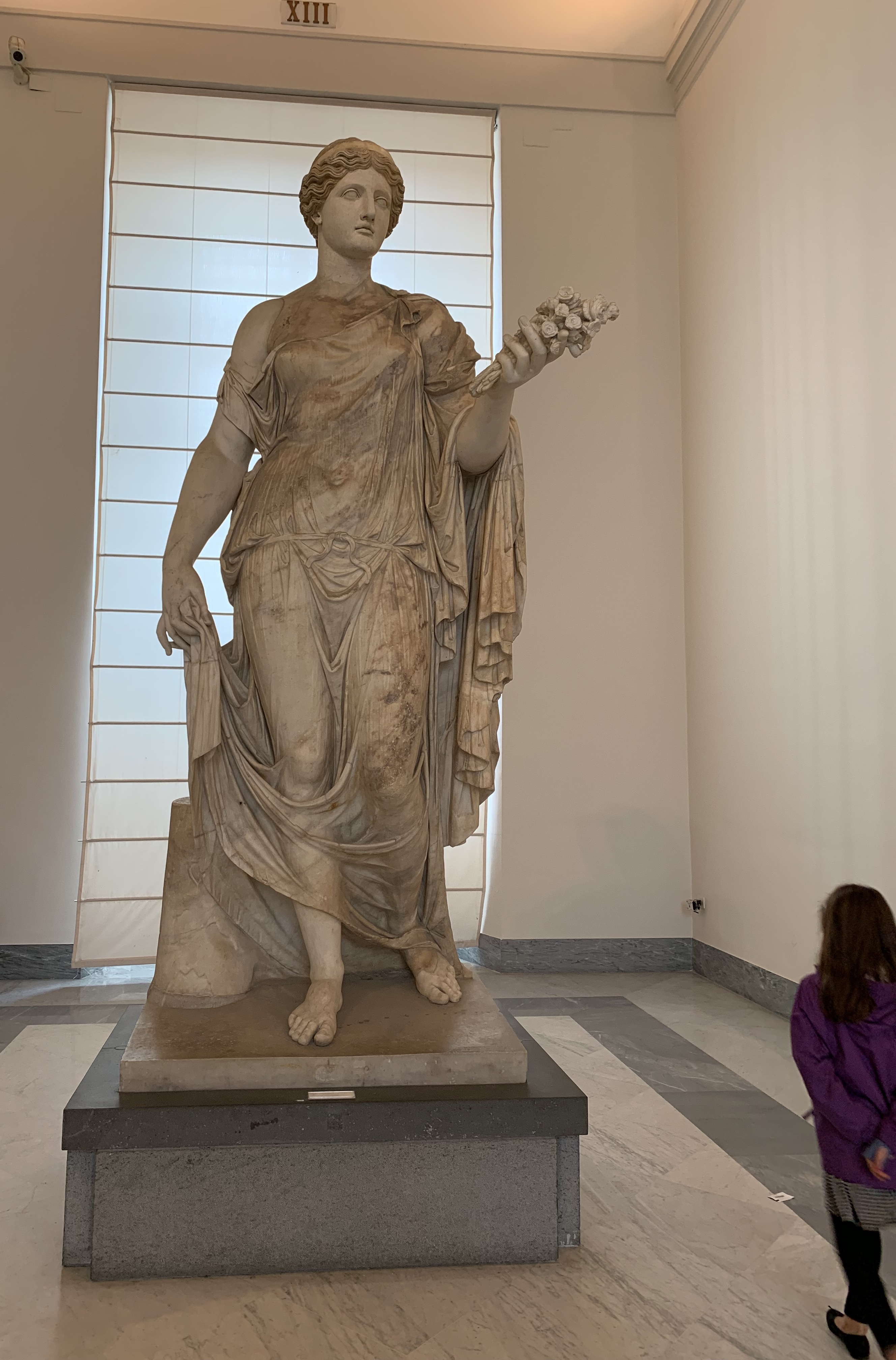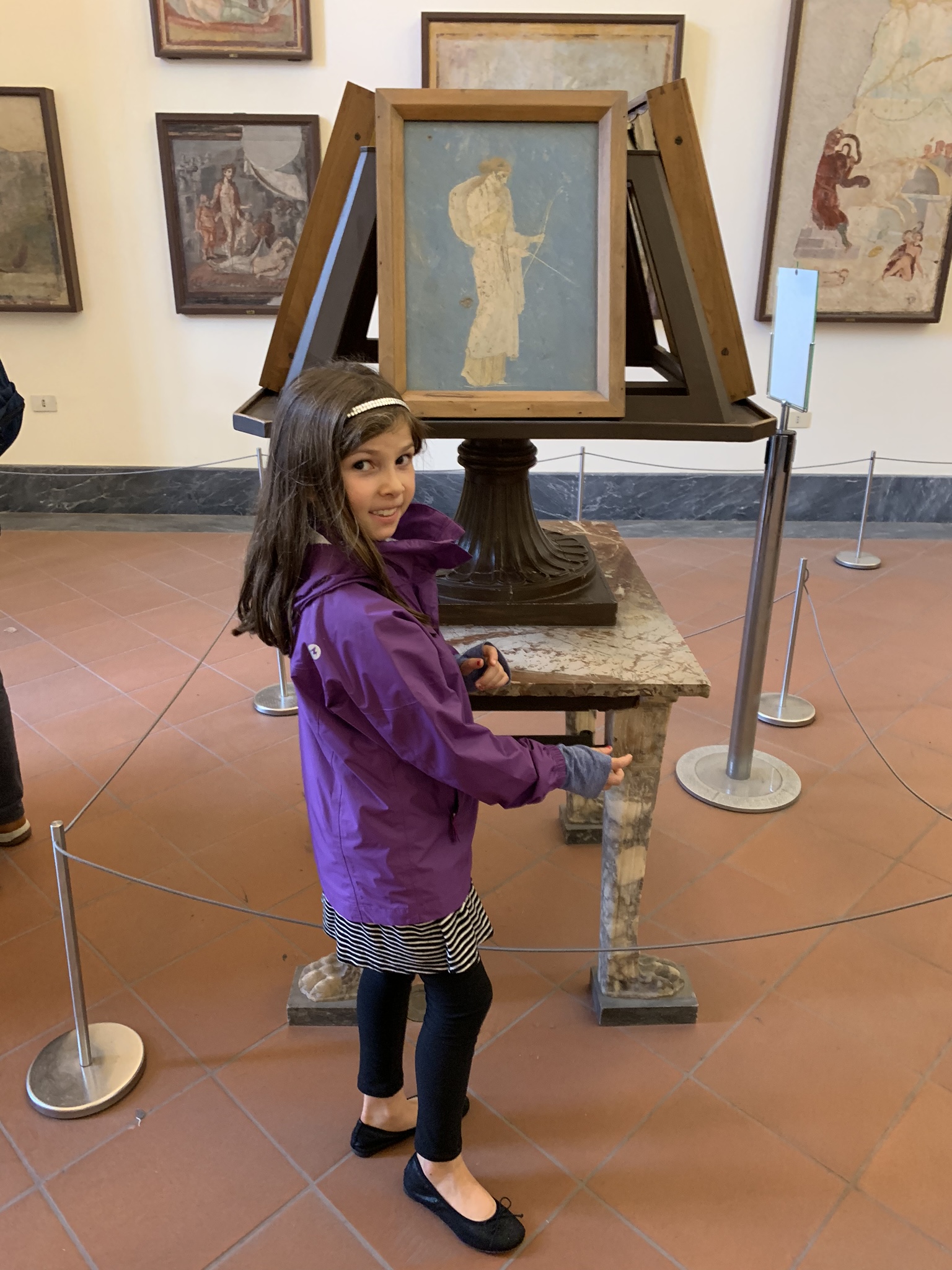 After lunch—and having dried out a bit from our rainy walk to lunch—we were off to the museum. When Pompeii was rediscovered in the 18th century, the then king of Naples is reported to have said, “bring all the best finds to me!” And so the archeological museum in Naples is truly a treasure trove of sculpture, mosaic, and fresco. We started on the ground floor, exploring the larger than life statues of all the usual suspects. Penelope wandered into one my pics (below)… note her “mains de gallerie”—hands clasped behind the back when in a museum, something she learned on her school field trips. A most excellent practice for small children!