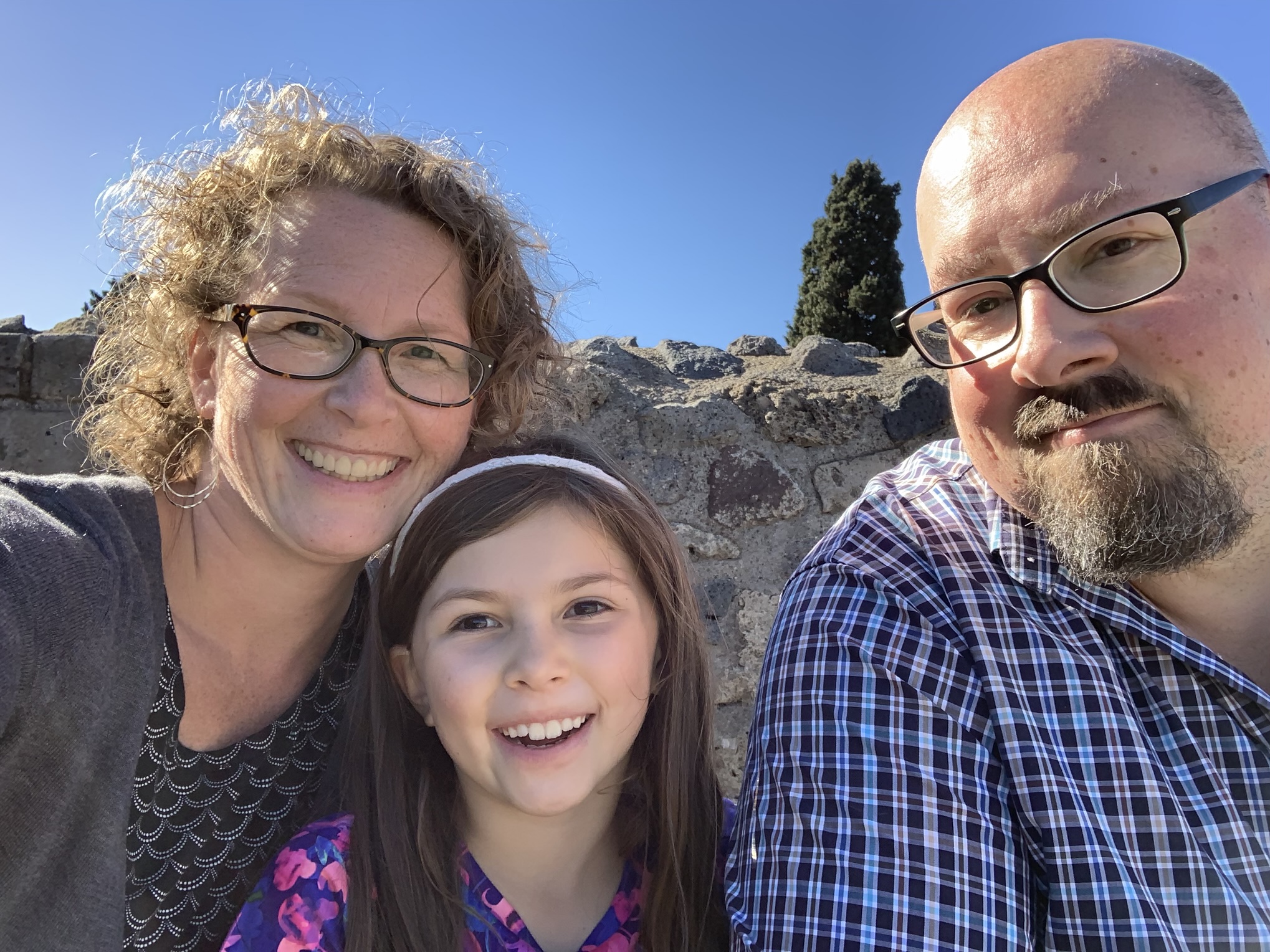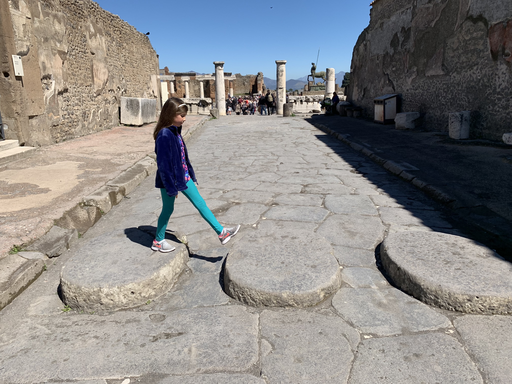 On Friday we had another day trip in the cards—a bit closer to Sorrento, but even older. We were off to Pompeii! This destination was one of Penelope’s main requests for our Italy trip, and the primary reason we’d decided to come south from Rome. She’d read a variety of historical fiction (and non-fiction) about Pompeii and its destruction, and so was eager to see the town for herself.