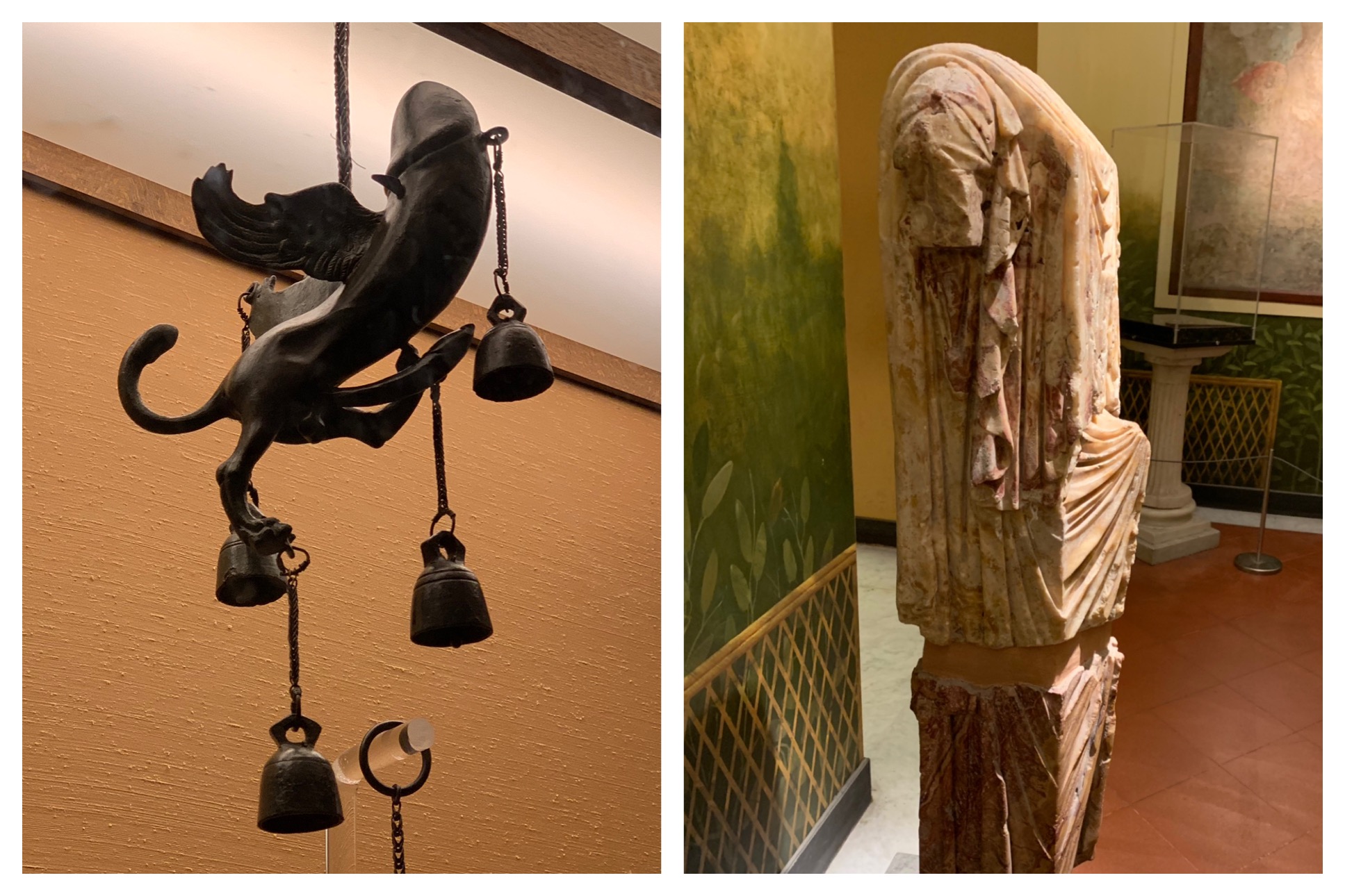 The last room at the Naples museum was the so-called Secret Cabinet, wherein are gathered all of the pieces of erotic art from Pompeii and Herculaneum. The gallery has been around since the early 1800s, but until the year 2000 was available only to scholars (and, apparently, male visitors willing to bribe museum staff). The gallery is now open to the general public, but there is a warning on the door that the rooms are not recommended for children under 14. Ha! Heeding this recommendation, Jeremy and I toured separately, so that Penelope would remain blissfully oblivious to the giant phalluses (phalli?) that lurked within these rooms. As a respectable middle-aged woman, I took very few photos… but couldn’t resist capturing these two pieces. Yes, that’s a set of wind chimes—and note the bulge in the toga.