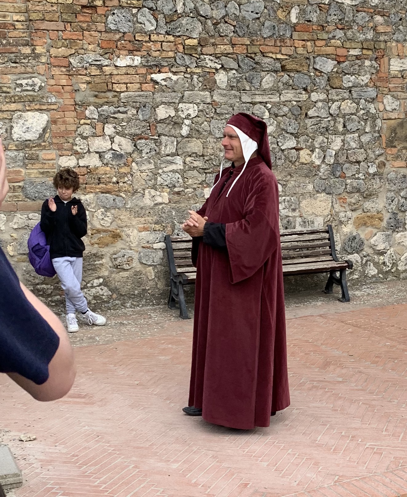 At the top of the hill, we spotted Dante himself, reciting the first lines of the Inferno from memory. My Italian is almost non-existent, but I immediately recognized those first lines: “Nel mezzo del cammin di nostra vita / mi ritrovai per una selva oscura, / ché la diritta via era smarrita.” A wonderful performance!