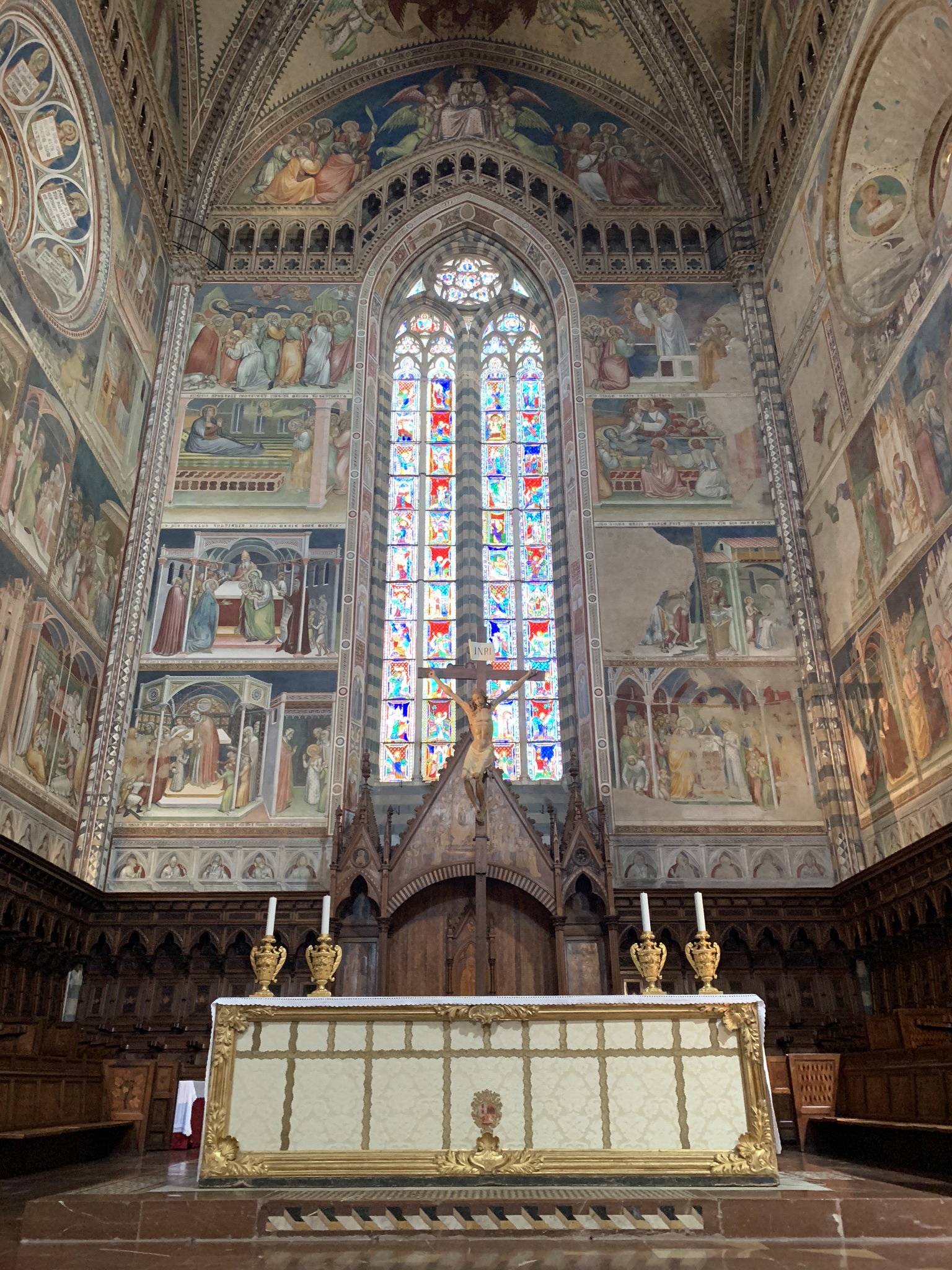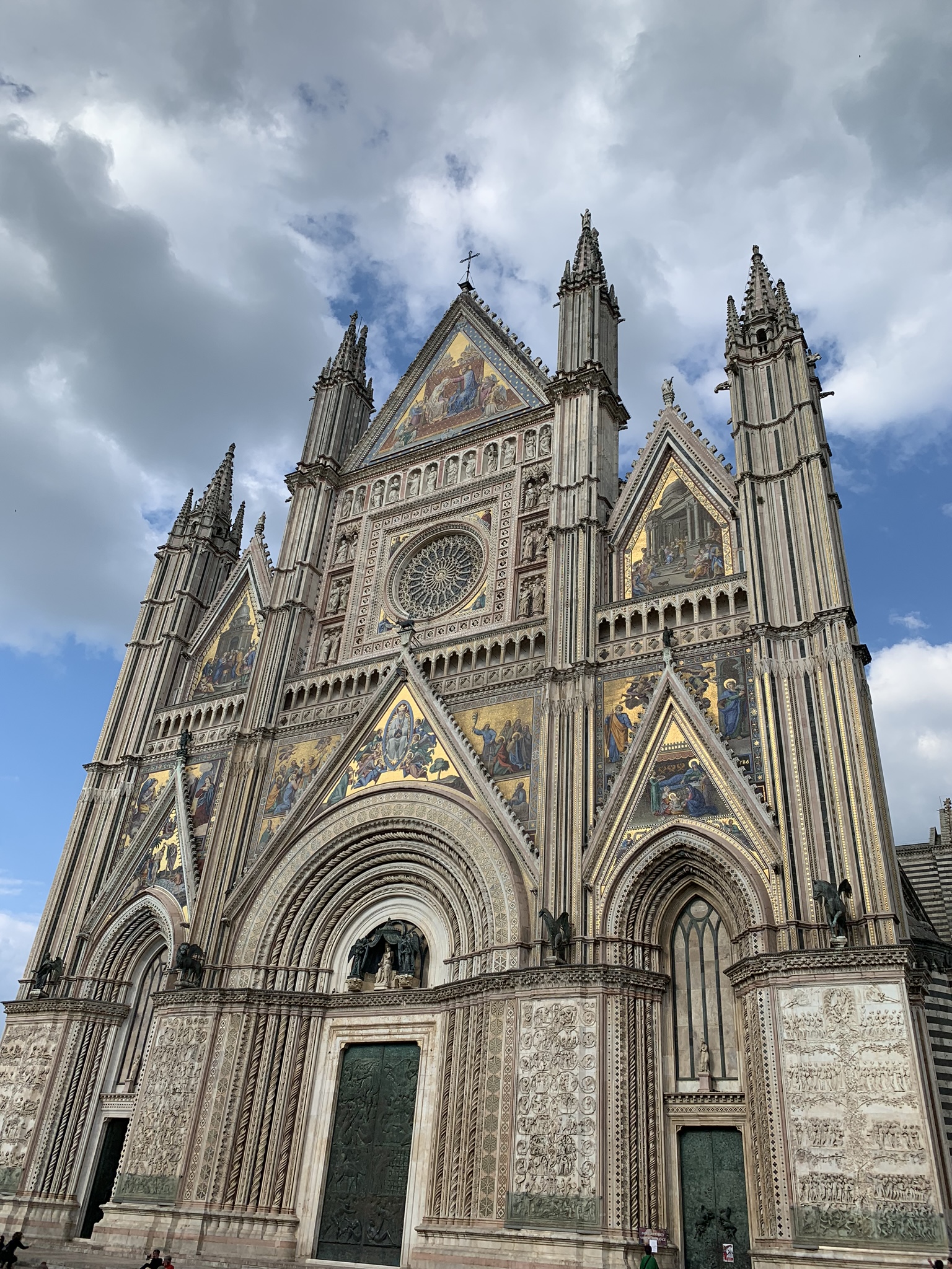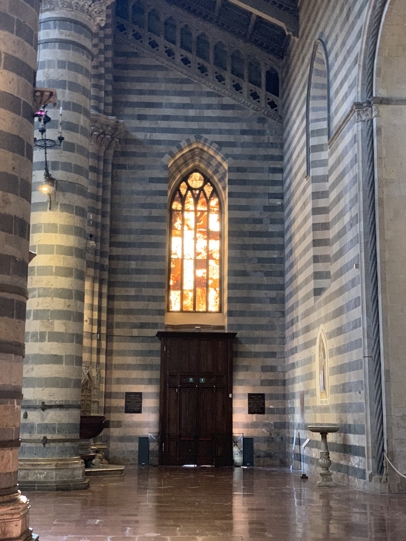 We reached the top and then boarded the city shuttle for just a few minutes, arriving at the cathedral and the heart of town. And the cathedral was simply gorgeous. Like nearby Florence, Orvieto chose to decorate the outside of the Duomo with lively marbles and mosaic, and the effect is quite stunning. But even more impressive is in the inside. The windows are a combination of stained glass and alabaster, and the latter bathes the church interior with a warm glow. The effect is one of soothing welcome, and that feeling is bolstered by the bright frescoes and golden glow from mosaics and painted ceiling stars.