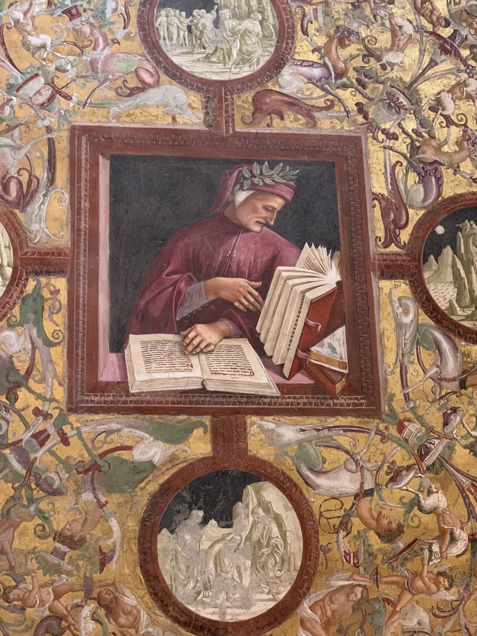 We spent an hour wandering around the interior, marveling in particular at the Chapel of San Brizio, painted by Luca Signorelli. The frescoes contain scenes from the Last Judgment, beginning with the preaching of the Antichrist (often thought to portray Savonarola) and ending with the Damned being tortured in Hell while the Elect enjoy Paradise. While it’s a familiar series of scenes, the paintings themselves are gorgeous—and quite realistically painted. And just below these larger frescoes, portraits of Italian artists and writers—these were two of my favorites.