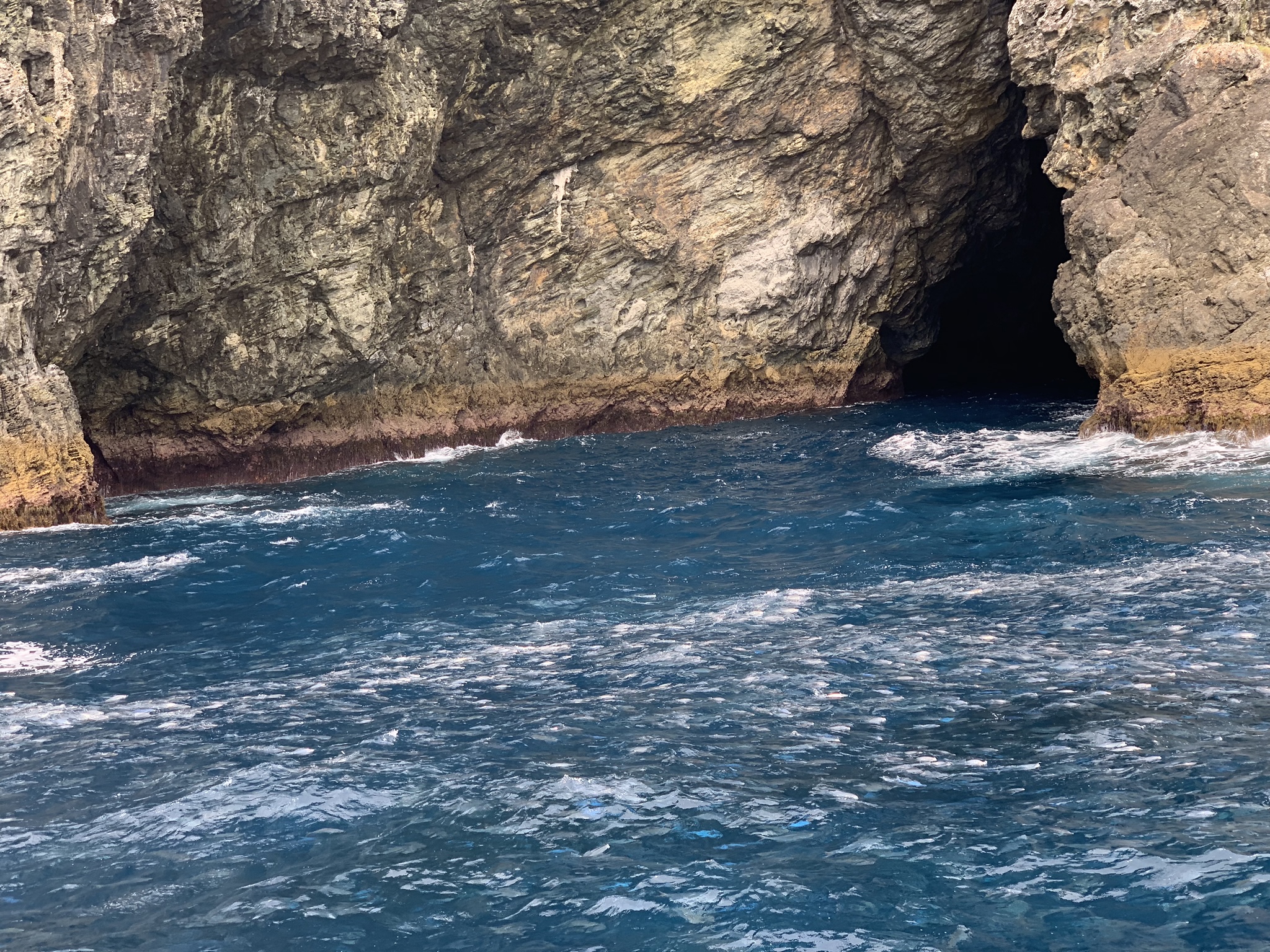 Nevertheless, we stayed in our seats above deck as the boat headed for the Hole in the Rock. We arrived without incident, and paused nearby to admire the island being slowly weathered away by the sea. And to notice the huge number of fish right near the surface, due, the captain said, to the rainy weather.