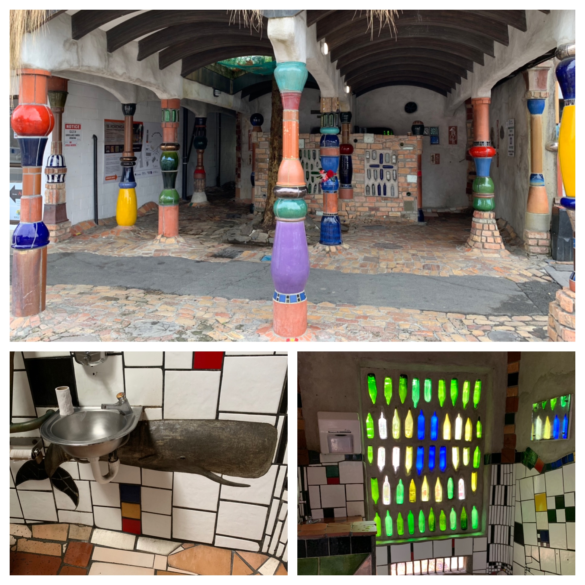 We did, however, stop briefly in Kawakawa to see the Hundertwasser toilets. Our guidebook had informed us that it was completed in 1999 by architect Friedensreich Hundertwasser, and is one of the few public toilets seen as a work of art;. And with that description, how could we not stop??