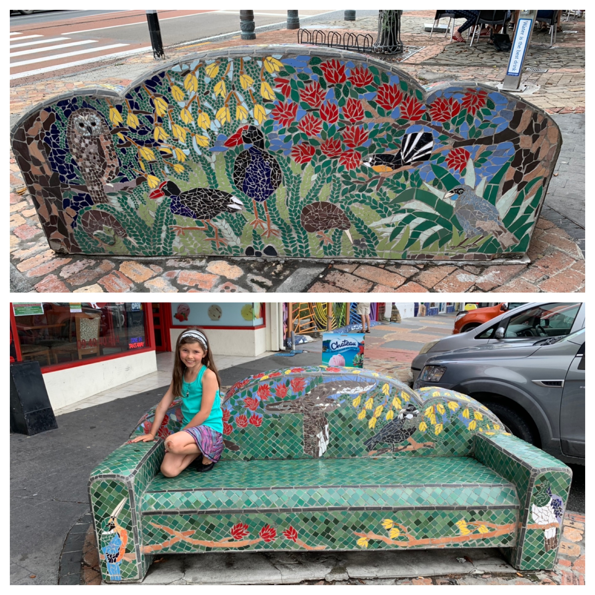 The toilet facility was indeed pretty cool, but I really liked the bench outside across the street. Wonderful mosaics of NZ birds!